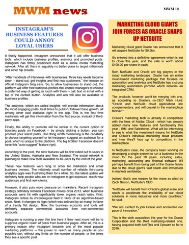 MWM news INSTAGRAM'S BUSINESS FEATURES COULD ANNOY LOYAL USERS It finally happened. Instagram announced that it will offer business tools, which include business profiles, analytics and promoted posts. Instagram has firmly positioned itself as a social media marketing network. After all, there is arguably no better place to target millennials and other hip crowds. “After hundreds of interviews with businesses, three key needs became clear -- stand out, get insights and find new customers,” the release on official Instagram blog says. So, to allow businesses to stand out, the platform will offer free business profiles that enable managers to choose a preferred way of getting in touch with them -- call, text or email with a tap of the contact button. Analytics and ads will also be available to business profiles. The analytics, which are called Insights, will provide information about the most engaging posts, best times to publish, follower base growth, all among other cool statistics right in the app. This is the first time marketers will get this information from the first source, instead of thirdparty apps. Finally, the ability to promote will be similar to the current option of boosting posts on Facebook -- by simply clicking a button, you can promote your select posts. One thing worth mentioning is the capability to choose targeting yourself or let Instagram suggest an audience for a post, which is unique to the platform. The big brother Facebook doesn’t have this “auto-suggest” feature (yet). According to the post, the new features will be first rolled out to users in the United States, Australia and New Zealand. The social network is planning to make new tools available to all users by the end of the year. These new features were long in order for marketers and small business owners. The relatively small number of reliable third-party analytics apps was frustrating them for a while. So, the latest update will definitely help people who are on Instagram to get exposure, reach new audiences and find new clients. However, it also puts more pressure on marketers. Recent Instagram strategy definitely reminds Facebook moves circa 2013, when business accounts were hit with significantly lower organic reach rates. First, Instagram retires its chronological feed in favor of an algorithm-based order. Next, it changes its logo (which was beloved by so many) in favor of a trendy flat design. Now, the business accounts and tools will definitely separate commercial accounts from non-commercial accounts. Instagram is running a very thin line here if their next move will be to suppress organic reach of posts from business pages. After all, this is a primary reason why Instagram became one of the most popular marketing platforms -- the power to reach as many people as you possibly can, without any limits on the number of people, or the times they see a specific post.