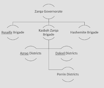 Zarqa, is one of 12 Governorate in Jordan. It is the third largest city in Jordan by population, located about 20 km northeast of the capital, Amman. It has an area about 160 km2, and it is about 619 meters above sea level. Zarqa contain three main brigades, which are (Kasbah Zarqa, Rusaifa and Hashemite). While Kasbah Zarqa include also three districts which are (Azraq, Daleel and Perrin).