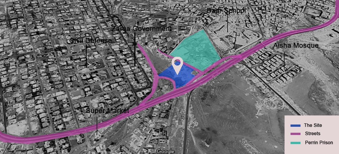 The proposed site is located in Zarqa - Perrin. The site is located next to Perrin Prison. The total land area of the site is approximately 11000 m2, and it’s proposed for two building, a rehabilitation and welfare center of male beggars with a built-up area of 1800 m2 and a juvenile education and rehabilitation center with a built-up area of 5000 m2. This thesis is focusing on the juvenile center only, while taking into consideration the site area to held two buildings. As this project consider a cultural and civic buildings its owned by Ministry of Social Development and will be followed by all country regulation framework.