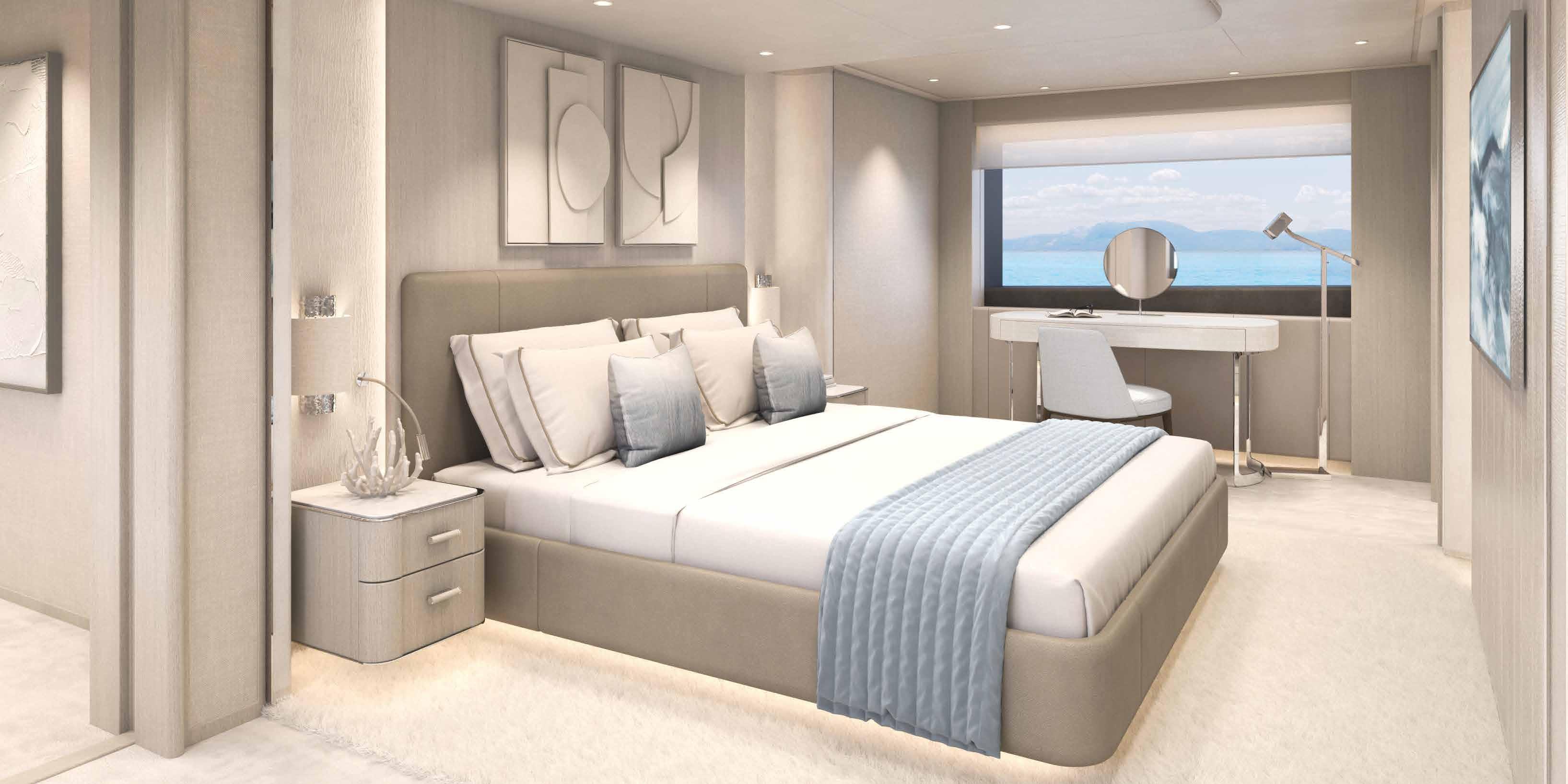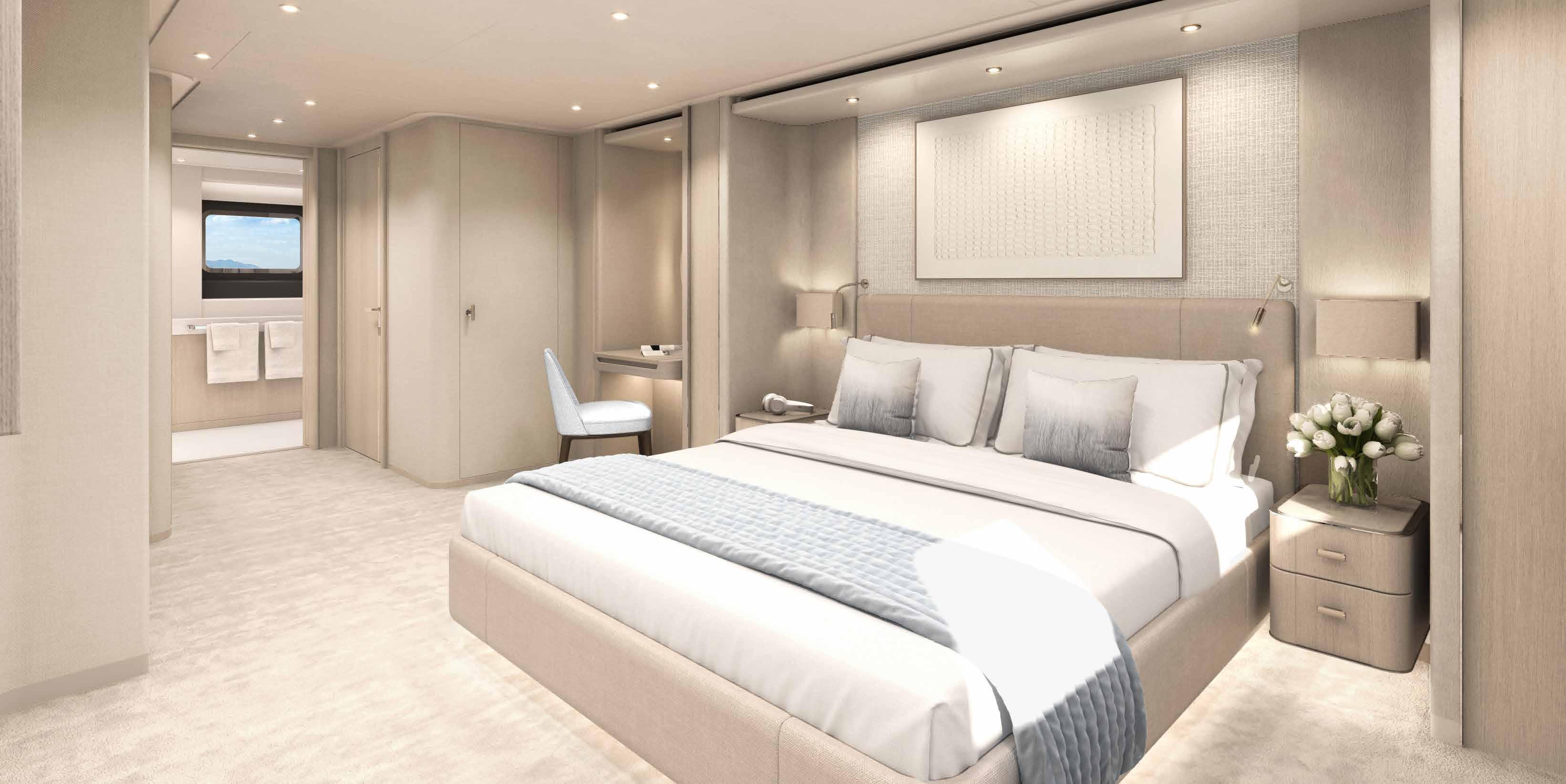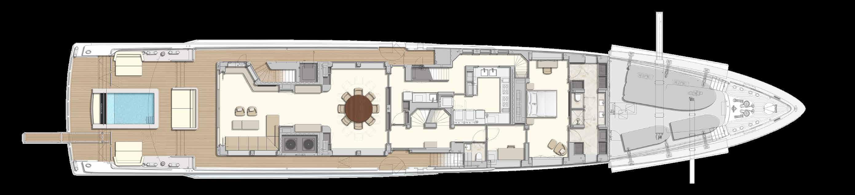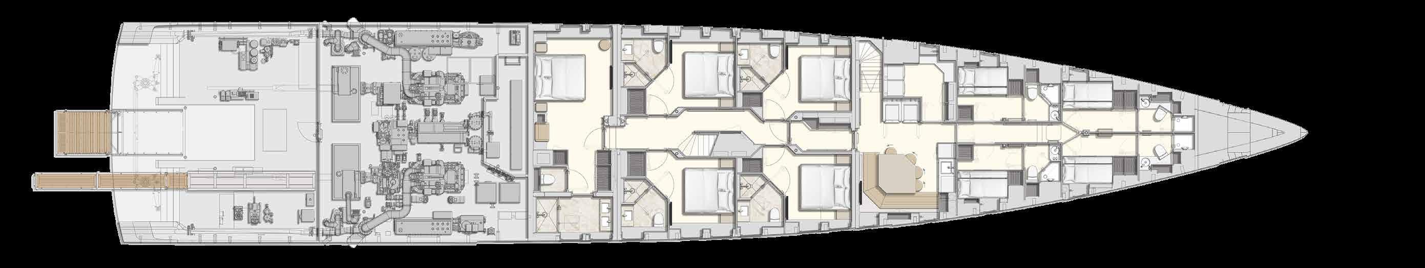 Suites Full-beam owner’s stateroom, one full-beam VIP suite, four double guest suites