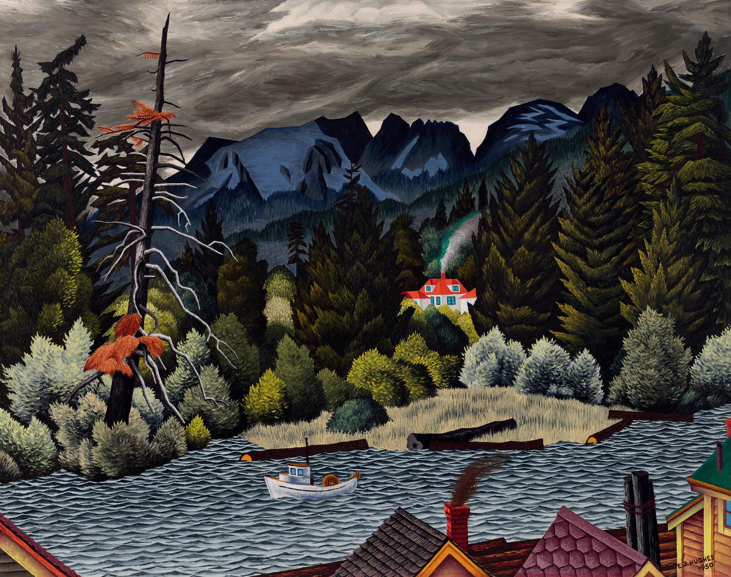 Waving hillS IS a spectacularly scaled and brilliant painting by Ted Harrison, an artist known as the quintessential painter of the Yukon. Harrison was born in the working-class town of Wingate, County Durham, Northern England in 1926 and did not arrive in the Yukon until 1968, after deployments to East Africa and India with the British Armed Forces and teaching posts in Malaysia and New Zealand. Although the colours and energies of these locations would stay with him throughout his career, the distinctive style he is now renowned for only emerged when he arrived in northern Alberta in 1967. He was offered a grant to write and illustrate his first children’s alphabet book as a teaching tool, depicting northern and Indigenous ways of living. He took stock of local animals, food preparation, industry, shelter, social dynamics and natural formations that would later shape the iconography of his northern paintings for decades to come.