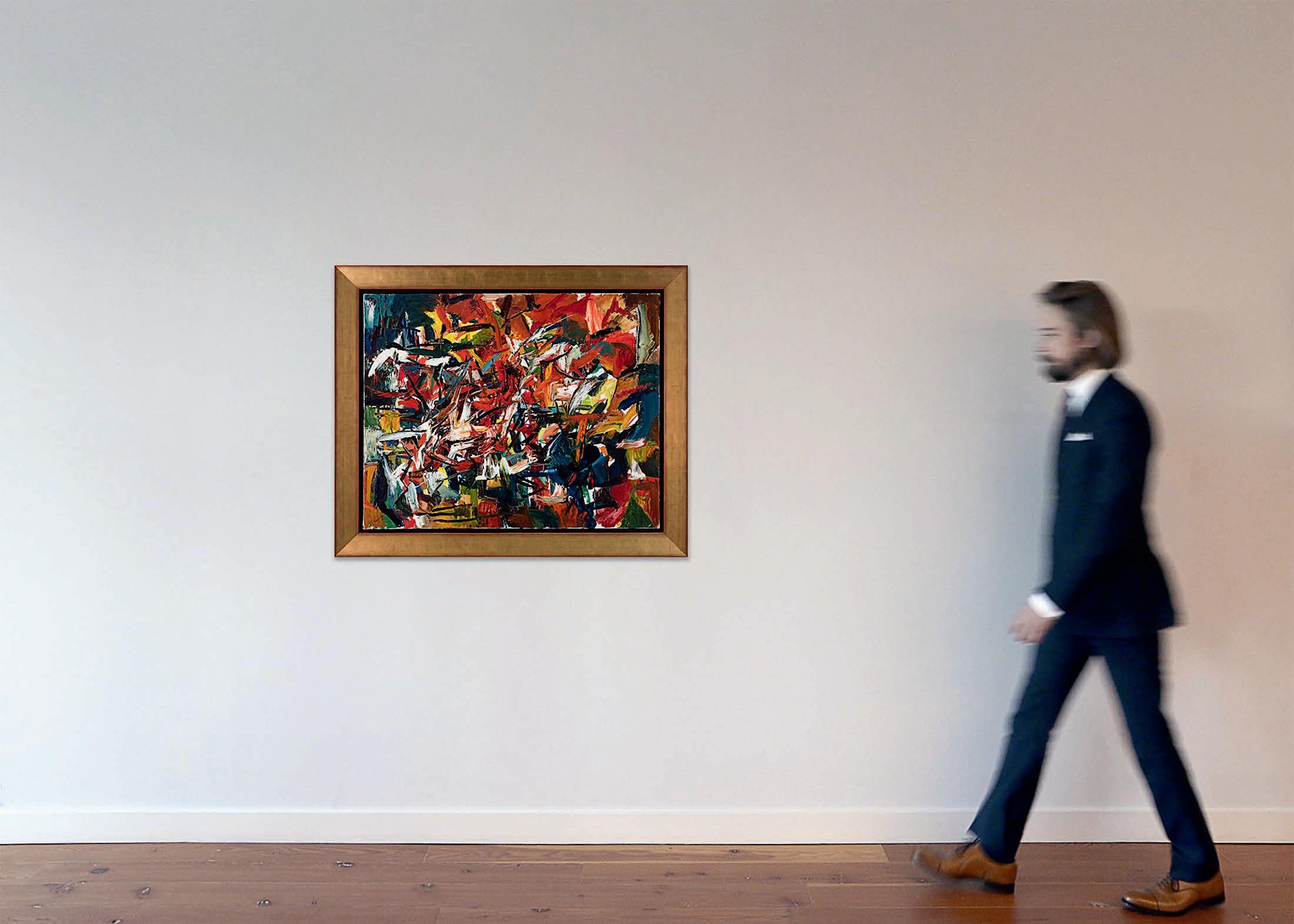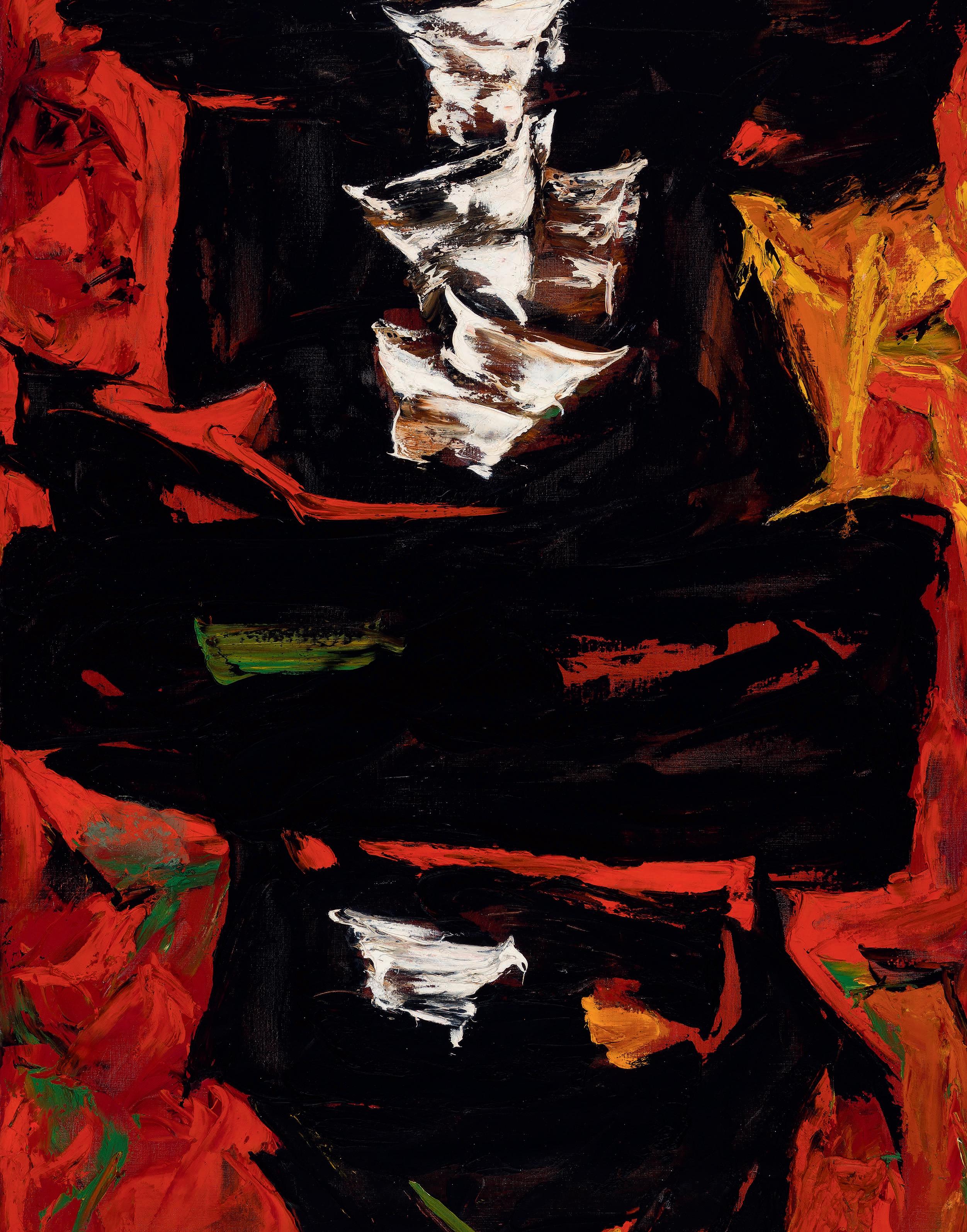 In this exceptional 1961 canvas, Letendre creates a charged, immersive composition, entwining lively currents of movement and gestural bands of vibrant colour against a stormy field of inky black rendered in heavy impasto. The overall impression is of something organic, chaotic and unruly. Vertical swathes of crimson surge upwards, framing the dynamic tableau, anchored by a swirling pool of tranquil cerulean. Gravitational forces course across the surface, converging in brilliant bursts of luminous white—a spark of renewal, of steadfast hope, of life against the surging void. Here, Letendre masterfully balances opposing visual forces—light and darkness, flux and stillness—and conjures the propulsive, emotive thrill of an artist in the throes of creative discovery. In a career defined by regeneration, experimentation and unrelenting evolution, this work stands as a remarkable example from a vital and visionary period.