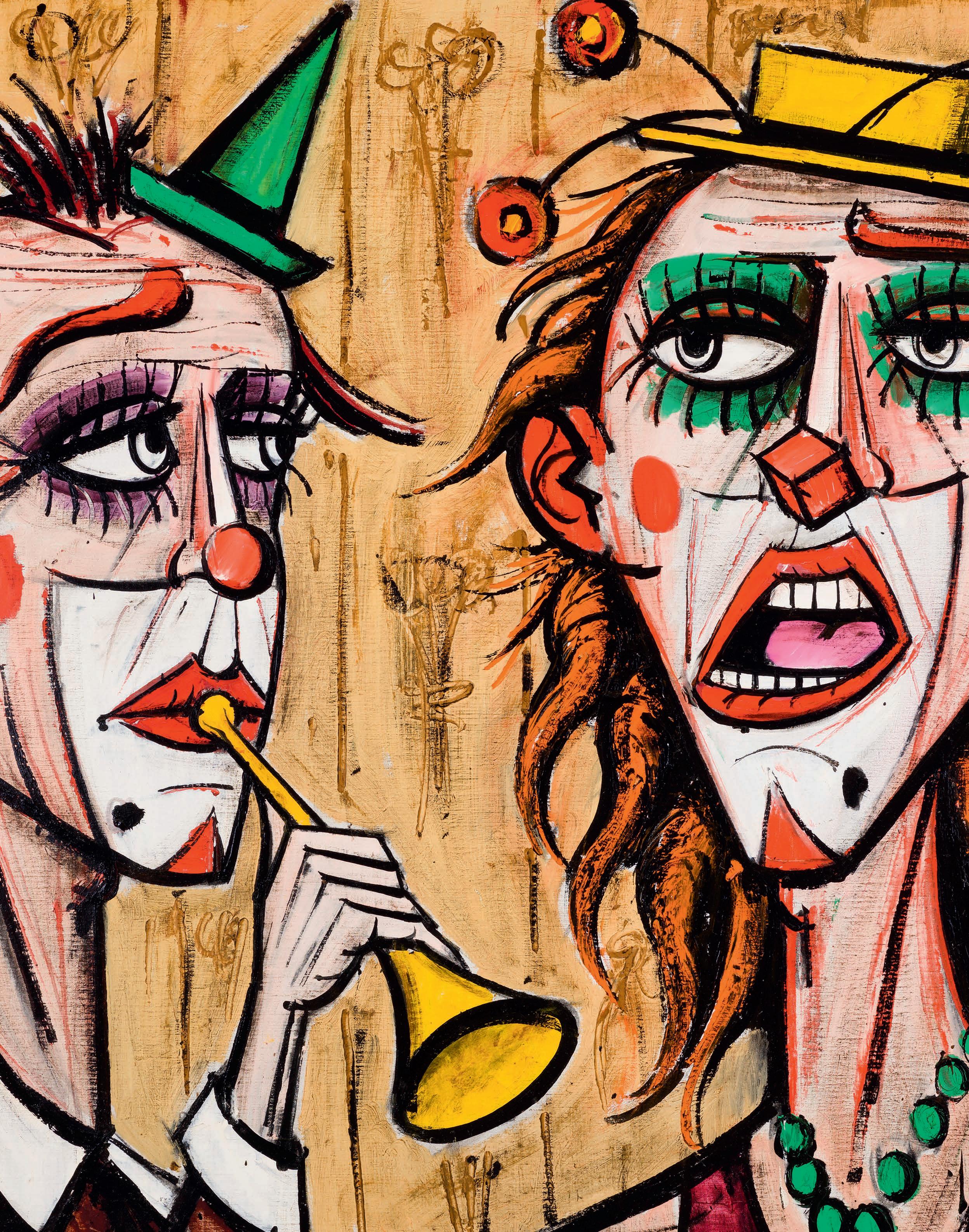 Although his work evokes an innocent charm, it evolved from an underpainting of hardships he experienced during a Depression-era childhood. Later, while serving with the British Army in Egypt between 1945 and 1950, he witnessed atrocities that deeply affected him. “There is enough pain and suffering in the world without putting it on our walls,” he told me. And so Harrison chose happy themes with an uncomplicated sense of joy.