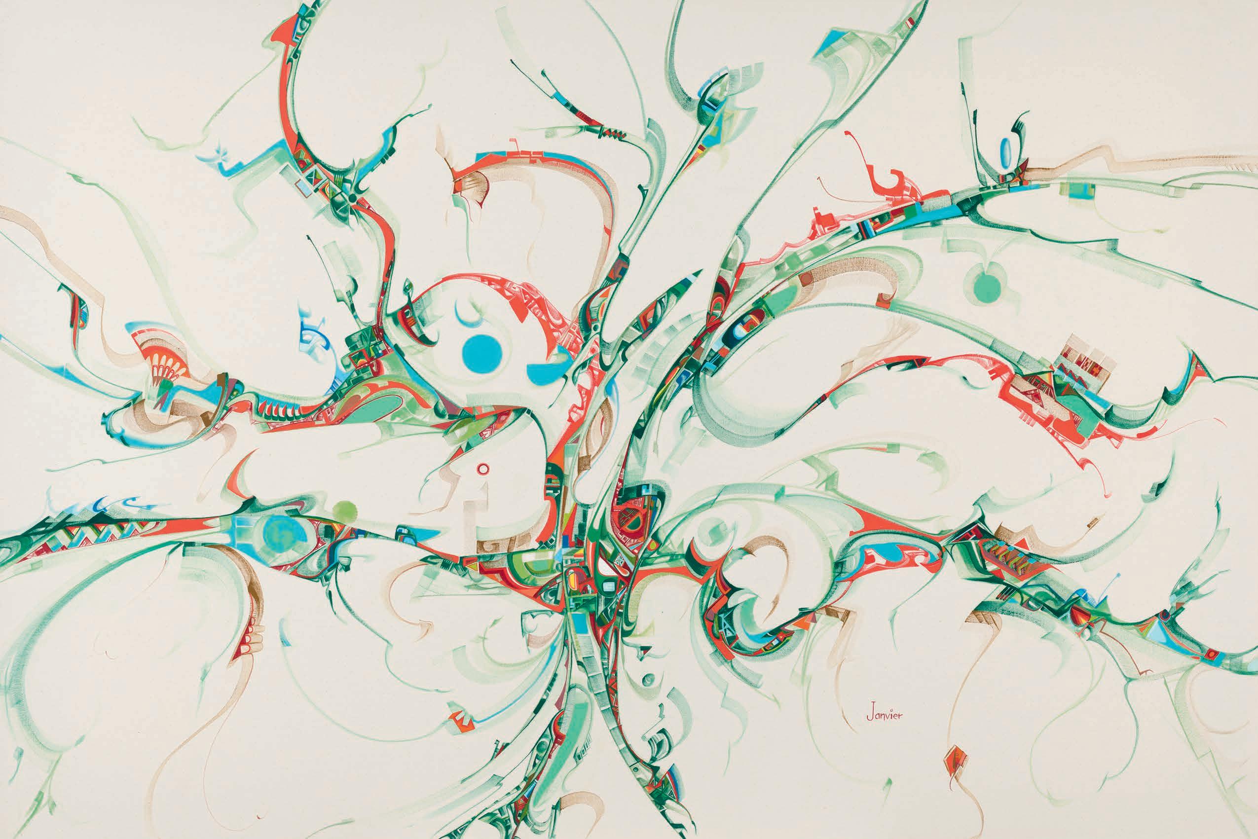ExoduS from ThE Soil is an impressively scaled and intricately detailed canvas by Denesųłiné artist Alex Janvier, completed in 1978. A warm white background serves as a spare field for Janvier’s wildly experimental and iconic brushed designs that were at the core of his more than 70-year career. With Exodus, Janvier has deviated from his strictly hard-edged paint application to include lightly brushed calligraphic strokes, like those typically used in underpainting while developing a canvas’s composition. Vine-like wisps burst outwards from the centre of the canvas like new growth searching for sunshine, water and support, forming an armature for Janvier’s harder, denser designs that cluster inside the connected systems in tones of cyan, orange and green.