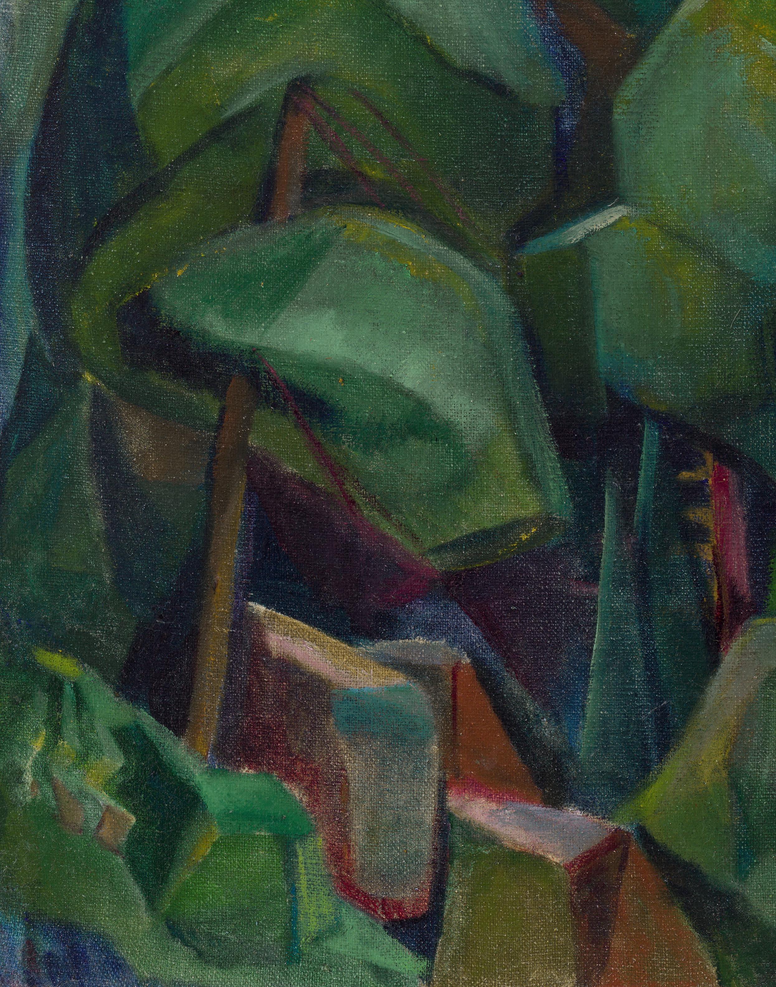 Summer Idyll IS the largest print in Walter J. Phillips’s body of work and a stellar example of his mastery of the woodcut medium. Complex in its layering, it required more than 12 different blocks to execute. Phillips was a perfectionist, and because he was dissatisfied with his first run of the subject, he destroyed it entirely. In 1924, two years prior to the completion of this print, Phillips traveled to England to work with British printmaker William Giles, who was part of the colour print revival. There at the same time was Japanese printmaker Yoshijiro Urushibara, who possessed the accumulated knowledge of generations of his country’s printmakers, and Phillips learned much from him, calling him “the most important living technician” in the field of colour woodcut. From Urushibara, he learned to size paper correctly, which enabled him to print with softer and lighter-coloured papers. He began to use powdered colours applied with starch and stated he could then “produce at will that