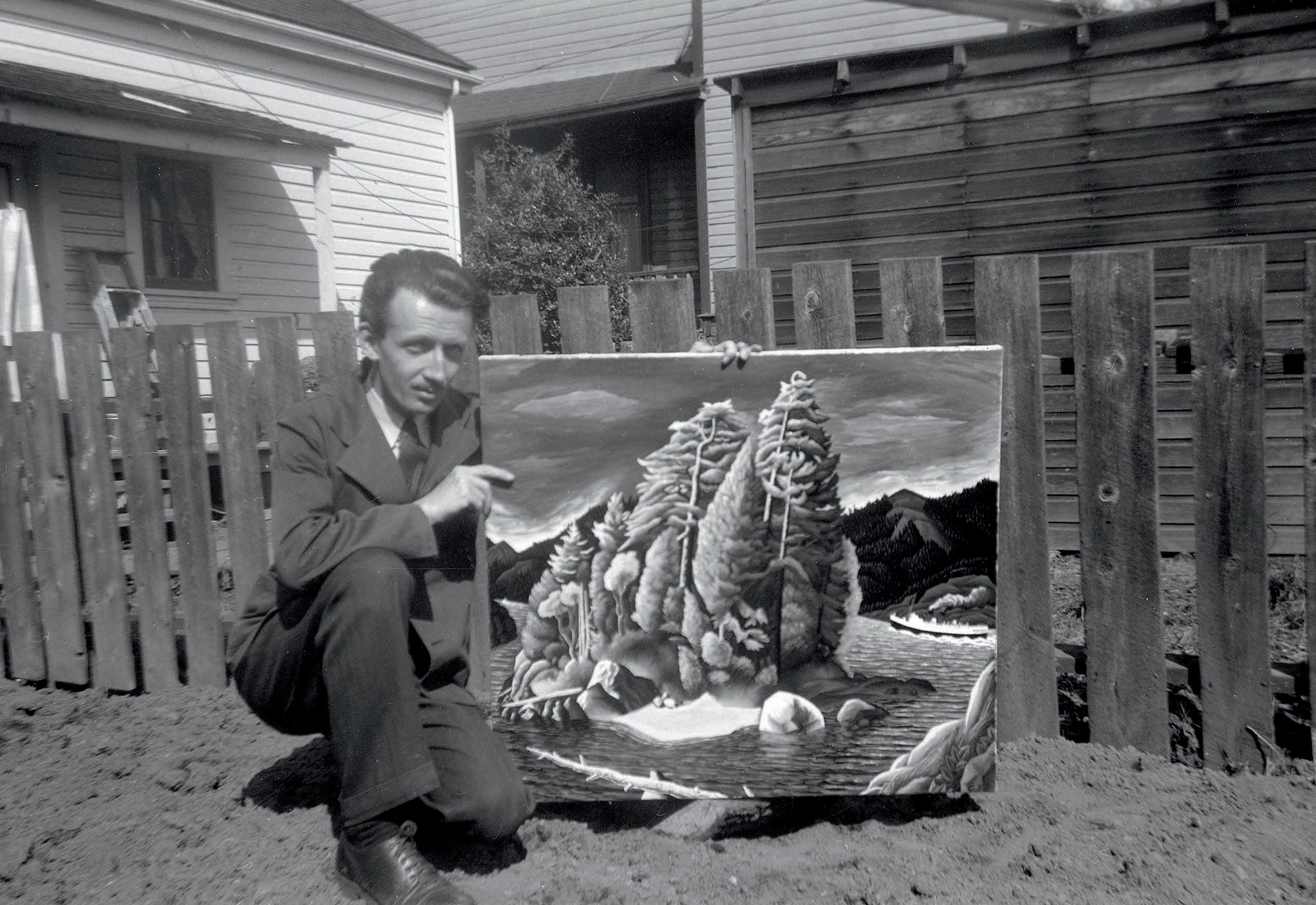 W.J. Phillips holding up his famous colour woodcut Karlukwees, BC , circa 1942