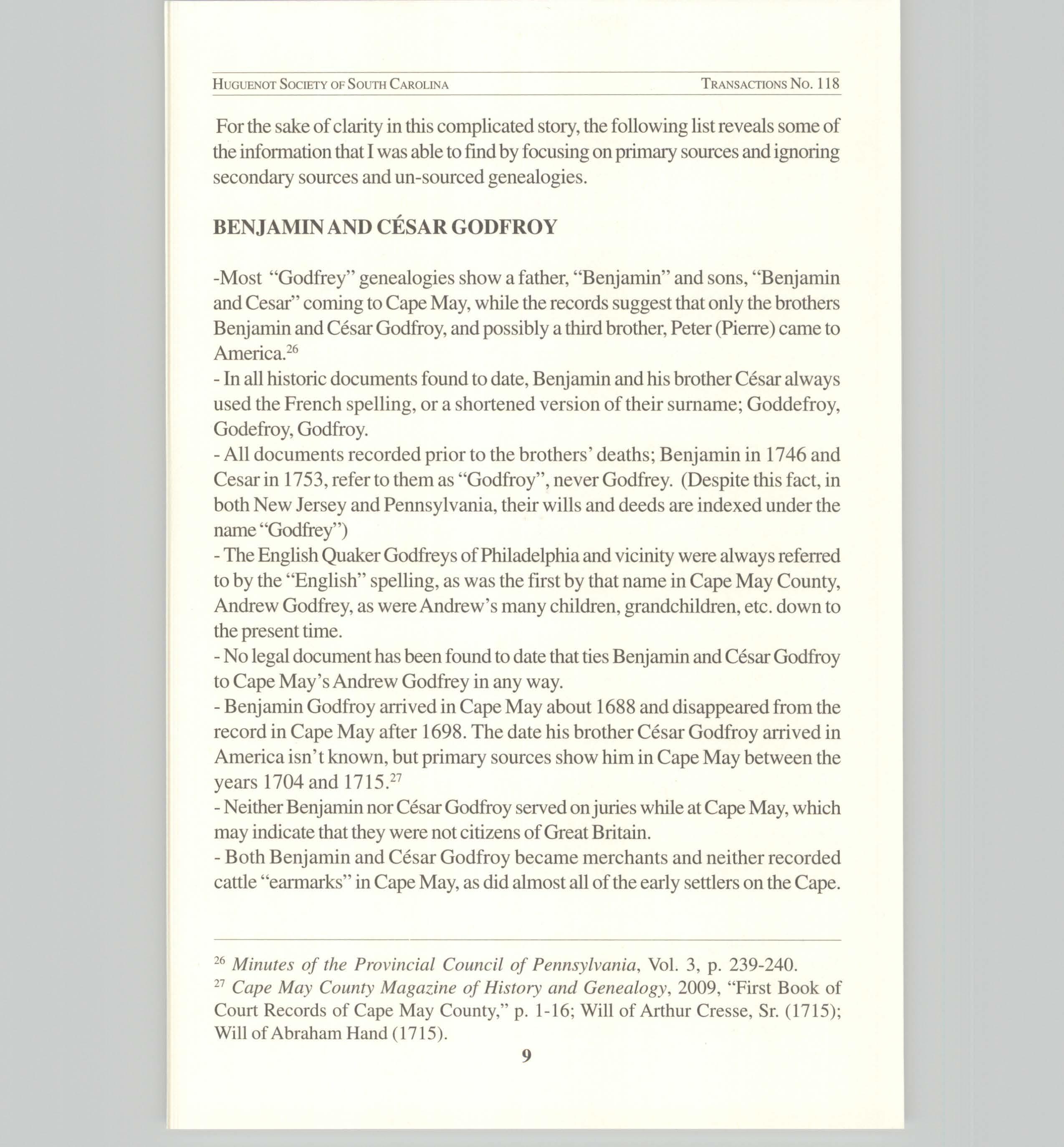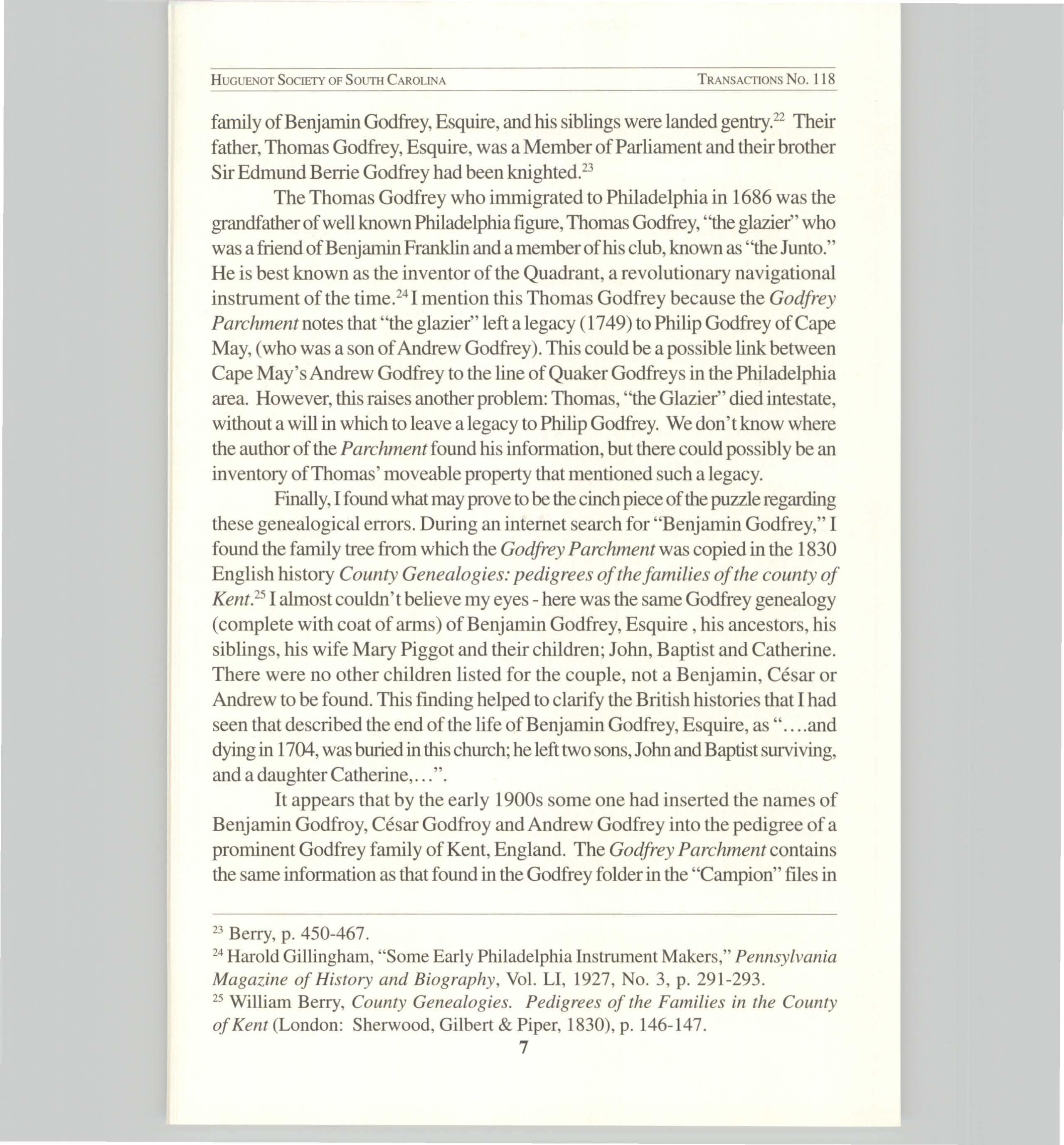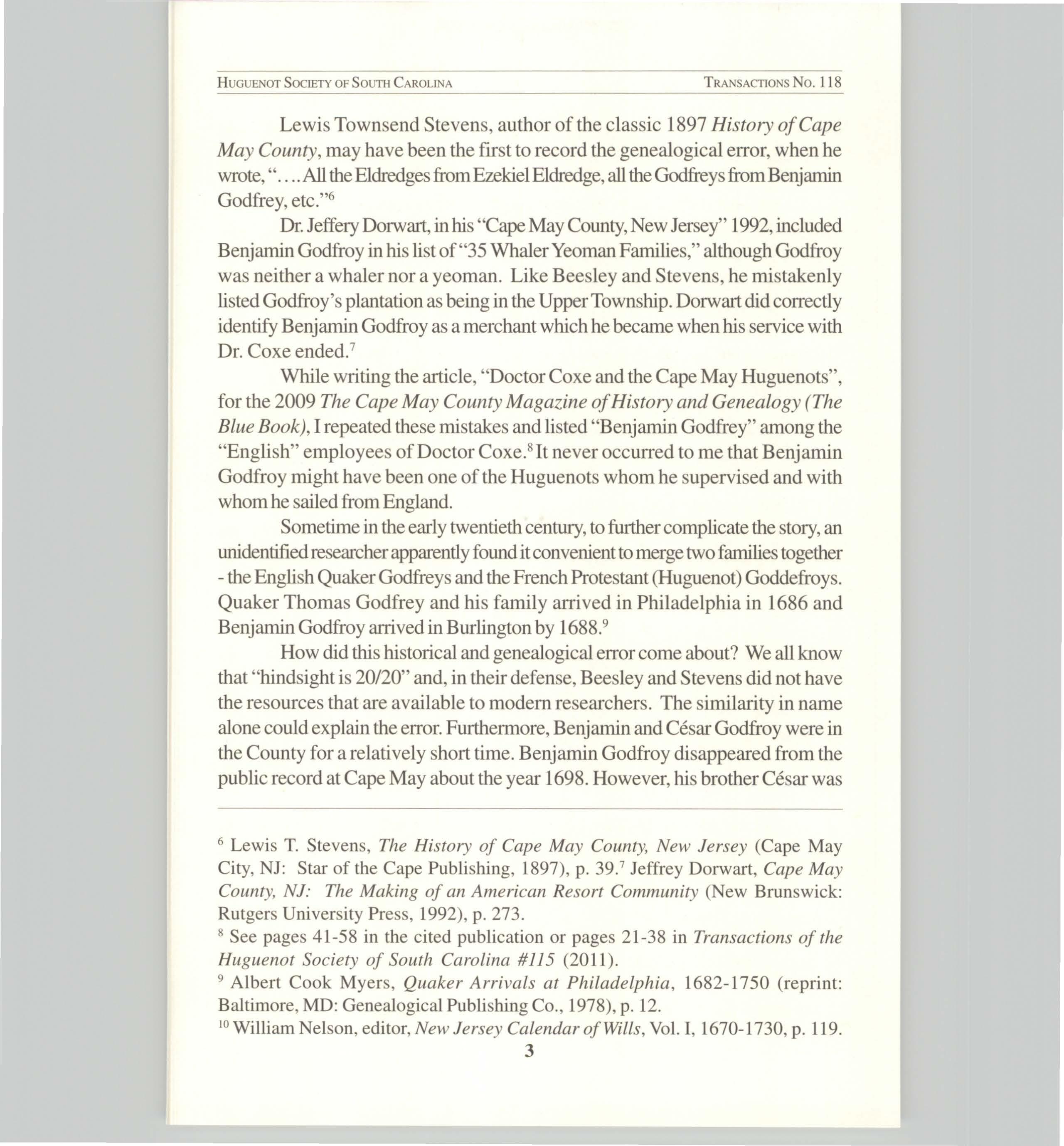 While writing the article, "Doctor Coxe and the Cape May Huguenots", for the 2009 The Cape May County Magazine of History and Genealogy (The Blue Book), I repeated these mistakes and listed "Benjamin Godfrey" among the "English" employees of Doctor Coxe. 8 It never occurred to me that Benjamin Godfray might have been one of the Huguenots whom he supervised and with whom he sailed from England.
