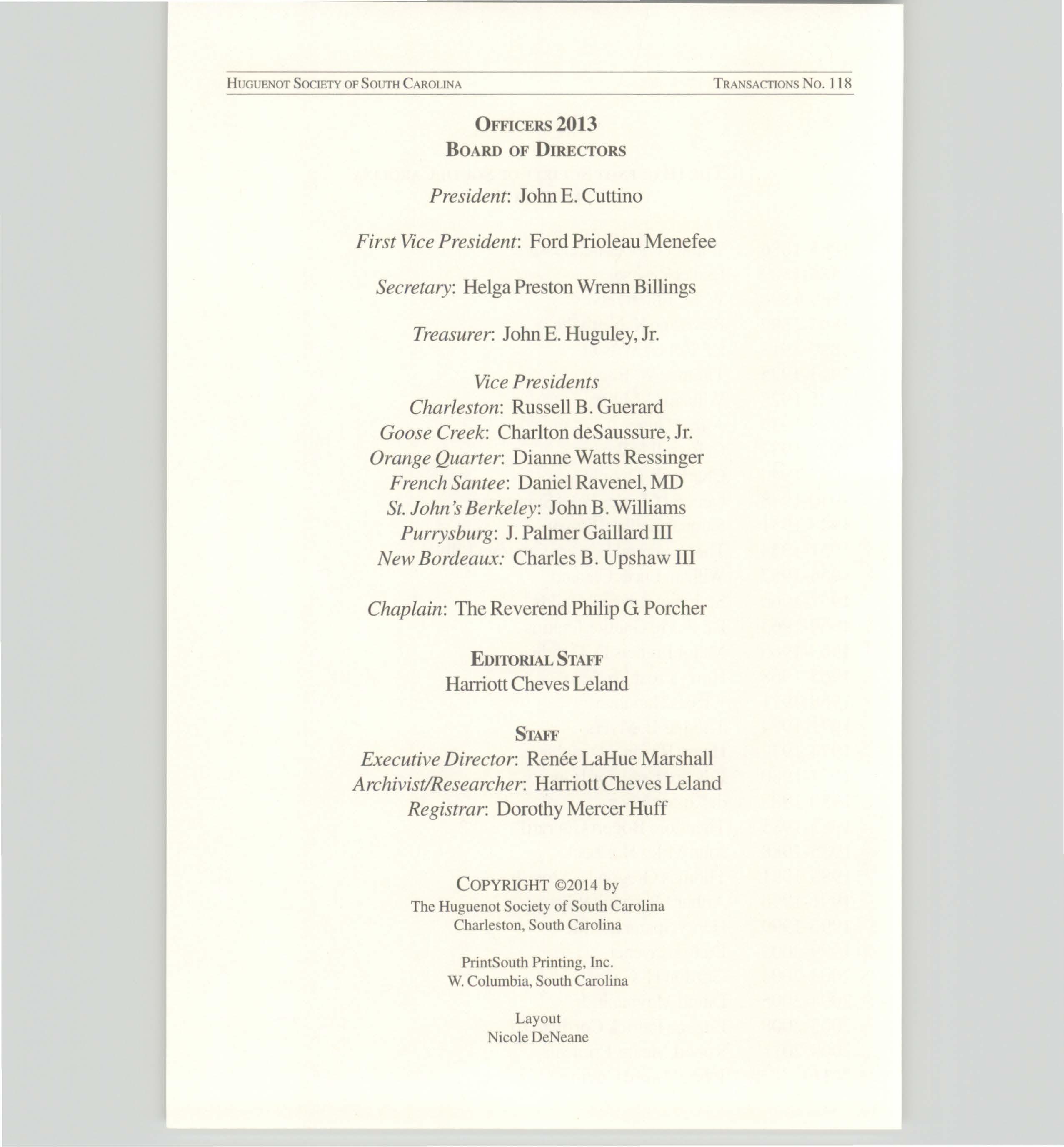 COPYRIGHT ©2014 by The Huguenot Society of South Carolina Charleston, South Carolina