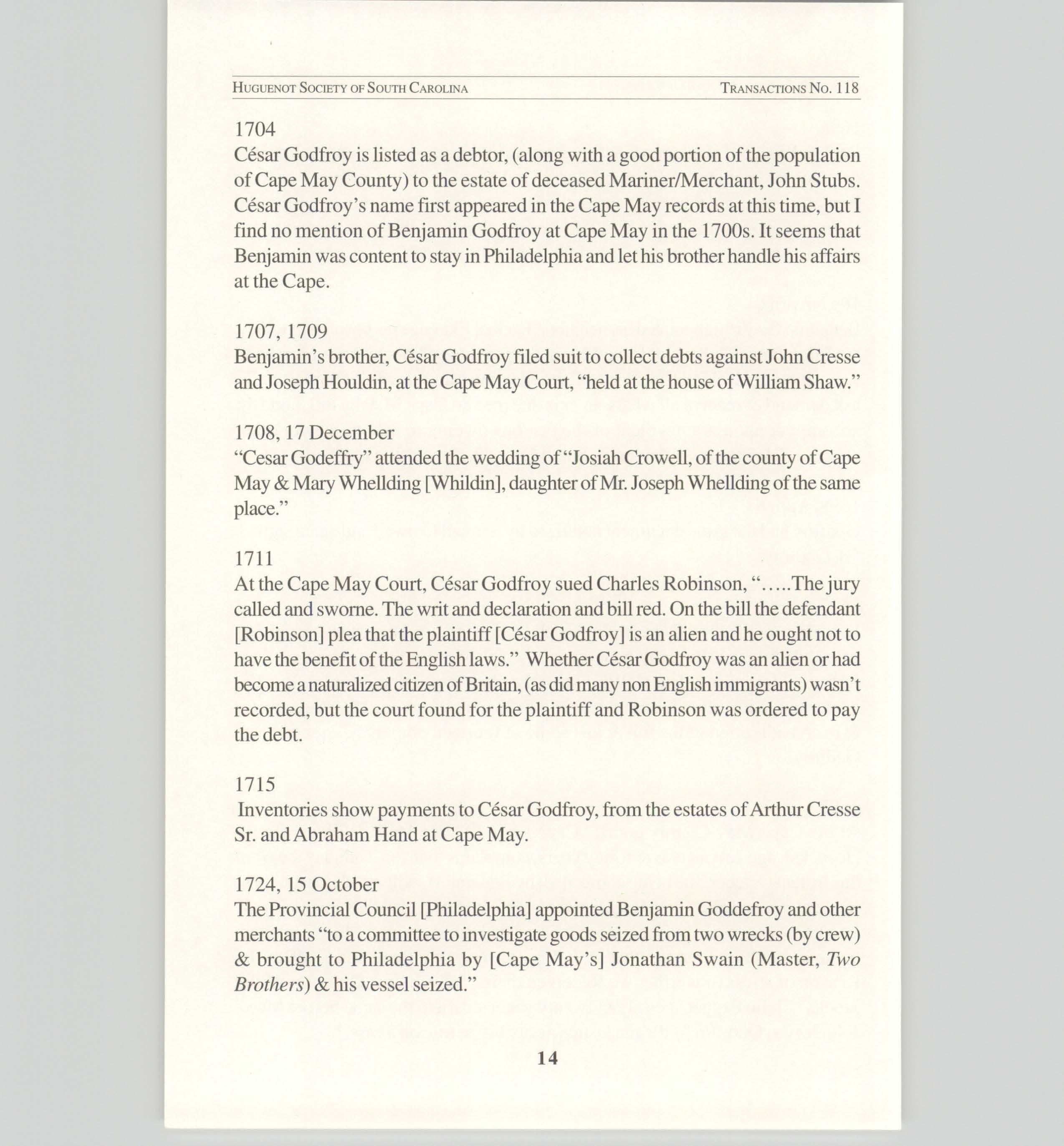 1 This article first appeared in The Cape May County New Jersey Magazine of History and Genealogy Vol. XII, No. 4, 2012. Acknowledgements: In addition to those mentioned in the article, the author would like to thank, Dr. Dan Stites, Joan Berkey, and Lois Bromell. Also Harriott Cheves Leland of the Huguenot Society of South Carolina and historian Glenn Bingham for their help.