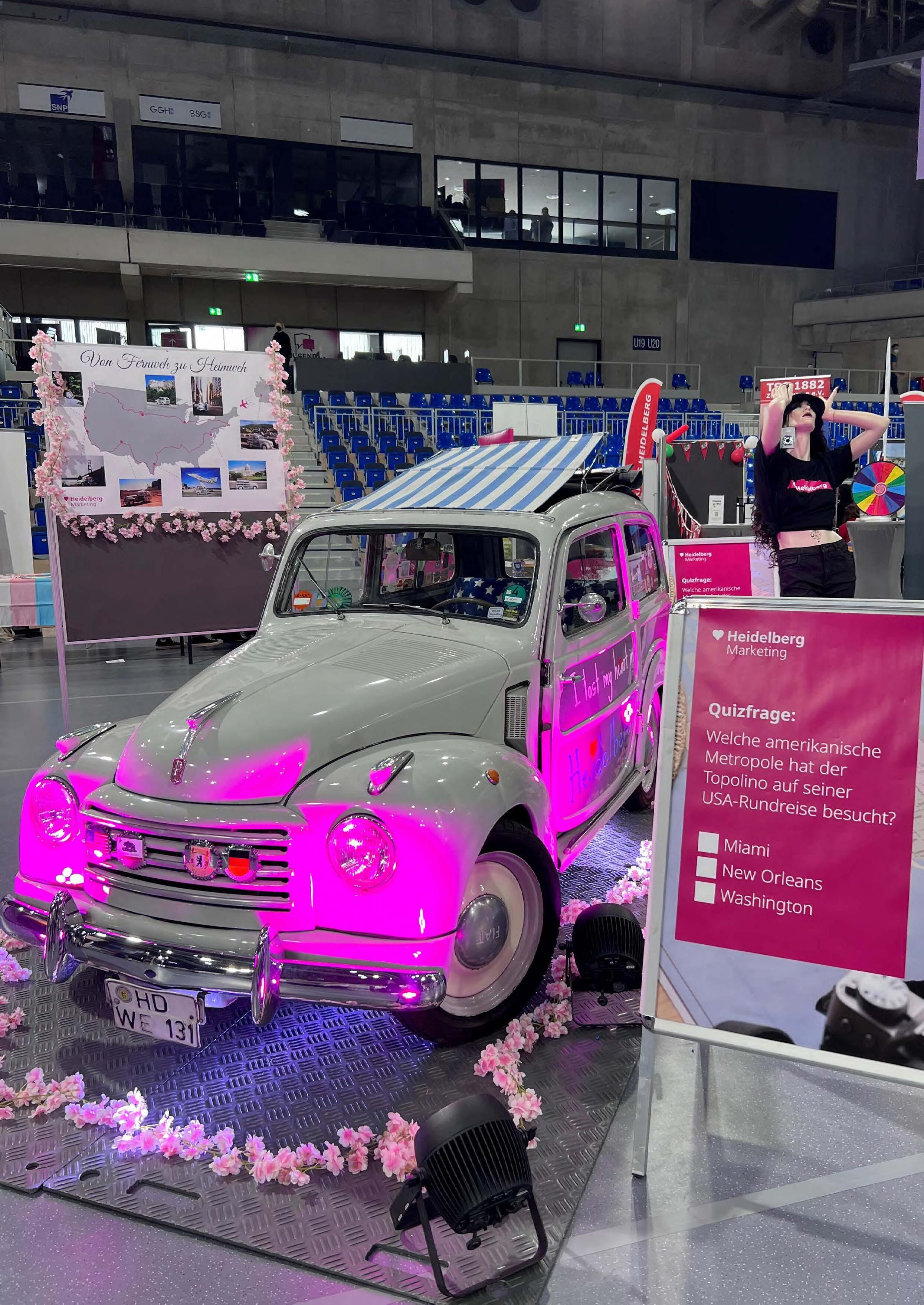 Auch Heidelberg Marketing war mit einem eigenen Stand vertreten. Das Highlight der Standpräsentation bildete die Ausstellung des historischen Fiat Topolino 500 C mit dem stadtweit bekannten Schriftzug “I lost my heart in Heidelberg“. Sowohl das Fahrzeug als auch die Impressionen seiner Rundreise durch Nordamerika zogen die Aufmerksamkeit vieler Besucherinnern und Besucher auf sich.
