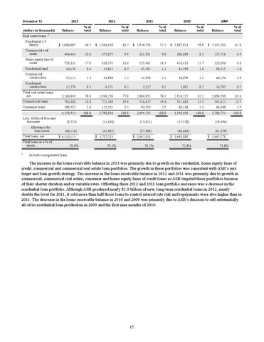 The increase in the loans receivable balance in 2013 was primarily due to growth in the residential, home equity lines of credit, commercial and commercial real estate loan portfolios. The growth in these portfolios was consistent with ASB’s mix target and loan growth strategy. The increase in the loans receivable balance in 2012 and 2011 was primarily due to growth in commercial, commercial real estate, consumer and home equity lines of credit loans as ASB targeted these portfolios because of their shorter duration and/or variable rates. Offsetting these 2012 and 2011 loan portfolio increases was a decrease in the residential loan portfolio. Although ASB produced nearly $1.0 billion of new, long-term residential loans in 2012, nearly double the level for 2011, it sold more than half those loans to control interest rate risk and repayments were also higher than in 2011. The decrease in the loans receivable balance in 2010 and 2009 was primarily due to ASB’s decision to sell substantially all of its residential loan production in 2009 and the first nine months of 2010.