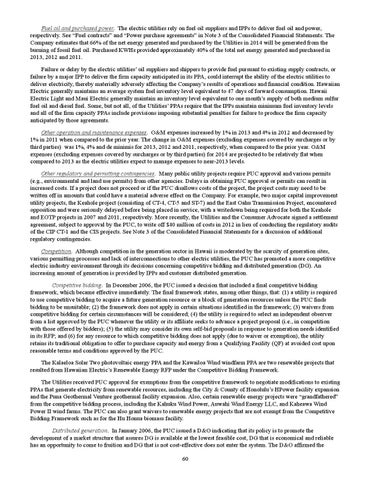 Fuel oil and purchased power. The electric utilities rely on fuel oil suppliers and IPPs to deliver fuel oil and power, respectively. See “Fuel contracts” and “Power purchase agreements” in Note 3 of the Consolidated Financial Statements. The Company estimates that 66% of the net energy generated and purchased by the Utilities in 2014 will be generated from the burning of fossil fuel oil. Purchased KWHs provided approximately 40% of the total net energy generated and purchased in 2013, 2012 and 2011. Failure or delay by the electric utilities’ oil suppliers and shippers to provide fuel pursuant to existing supply contracts, or failure by a major IPP to deliver the firm capacity anticipated in its PPA, could interrupt the ability of the electric utilities to deliver electricity, thereby materially adversely affecting the Company’s results of operations and financial condition. Hawaiian Electric generally maintains an average system fuel inventory level equivalent to 47 days of forward consumption. Hawaii Electric Light and Maui Electric generally maintain an inventory level equivalent to one month’s supply of both medium sulfur fuel oil and diesel fuel. Some, but not all, of the Utilities’ PPAs require that the IPPs maintain minimum fuel inventory levels and all of the firm capacity PPAs include provisions imposing substantial penalties for failure to produce the firm capacity anticipated by those agreements. Other operation and maintenance expenses. O&M expenses increased by 1% in 2013 and 4% in 2012 and decreased by 1% in 2011 when compared to the prior year. The change in O&M expenses (excluding expenses covered by surcharges or by third parties) was 1%, 4% and de minimis for 2013, 2012 and 2011, respectively, when compared to the prior year. O&M expenses (excluding expenses covered by surcharges or by third parties) for 2014 are projected to be relatively flat when compared to 2013 as the electric utilities expect to manage expenses to near-2013 levels. Other regulatory and permitting contingencies. Many public utility projects require PUC approval and various permits (e.g., environmental and land use permits) from other agencies. Delays in obtaining PUC approval or permits can result in increased costs. If a project does not proceed or if the PUC disallows costs of the project, the project costs may need to be written off in amounts that could have a material adverse effect on the Company. For example, two major capital improvement utility projects, the Keahole project (consisting of CT-4, CT-5 and ST-7) and the East Oahu Transmission Project, encountered opposition and were seriously delayed before being placed in service, with a writedown being required for both the Keahole and EOTP projects in 2007 and 2011, respectively. More recently, the Utilities and the Consumer Advocate signed a settlement agreement, subject to approval by the PUC, to write off $40 million of costs in 2012 in lieu of conducting the regulatory audits of the CIP CT-1 and the CIS projects. See Note 3 of the Consolidated Financial Statements for a discussion of additional regulatory contingencies. Competition. Although competition in the generation sector in Hawaii is moderated by the scarcity of generation sites, various permitting processes and lack of interconnections to other electric utilities, the PUC has promoted a more competitive electric industry environment through its decisions concerning competitive bidding and distributed generation (DG). An increasing amount of generation is provided by IPPs and customer distributed generation. Competitive bidding. In December 2006, the PUC issued a decision that included a final competitive bidding framework, which became effective immediately. The final framework states, among other things, that: (1) a utility is required to use competitive bidding to acquire a future generation resource or a block of generation resources unless the PUC finds bidding to be unsuitable; (2) the framework does not apply in certain situations identified in the framework; (3) waivers from competitive bidding for certain circumstances will be considered; (4) the utility is required to select an independent observer from a list approved by the PUC whenever the utility or its affiliate seeks to advance a project proposal (i.e., in competition with those offered by bidders); (5) the utility may consider its own self-bid proposals in response to generation needs identified in its RFP; and (6) for any resource to which competitive bidding does not apply (due to waiver or exemption), the utility retains its traditional obligation to offer to purchase capacity and energy from a Qualifying Facility (QF) at avoided cost upon reasonable terms and conditions approved by the PUC. The Kalaeloa Solar Two photovoltaic energy PPA and the Kawailoa Wind windfarm PPA are two renewable projects that resulted from Hawaiian Electric’s Renewable Energy RFP under the Competitive Bidding Framework. The Utilities received PUC approval for exemptions from the competitive framework to negotiate modifications to existing PPAs that generate electricity from renewable resources, including the City & County of Honolulu’s HPower facility expansion and the Puna Geothermal Venture geothermal facility expansion. Also, certain renewable energy projects were “grandfathered” from the competitive bidding process, including the Kahuku Wind Power, Auwahi Wind Energy LLC, and Kaheawa Wind Power II wind farms. The PUC can also grant waivers to renewable energy projects that are not exempt from the Competitive Bidding Framework such as for the Hu Honua biomass facility. Distributed generation. In January 2006, the PUC issued a D&O indicating that its policy is to promote the development of a market structure that assures DG is available at the lowest feasible cost, DG that is economical and reliable has an opportunity to come to fruition and DG that is not cost-effective does not enter the system. The D&O