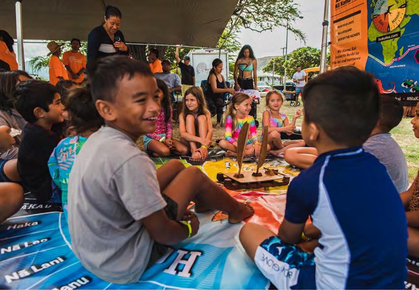 watermen and waterwomen to help the child safely play in Hawaiian waters. That is where Nā Kama Kai came in with the ocean clinics across O‘ahu that are free for keiki. These one-day events bring children together with “uncles and aunties” that love the ocean to guide them in five stations or educational pillars of Nā Kama Kai: K.A.I. (Ocean Safety); Ho‘okele (Wayfinding); Mālama Kai (Papahānaumokuākea); Surfing and Ma Ka Hana Ka ‘Ike (Learn By Doing); Hoe Wa‘a (canoe perspective of the ahupua‘a).