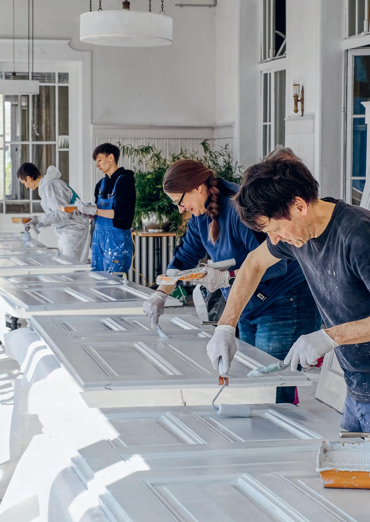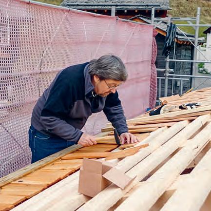 Gemeinsam macht es doppelt Freude: An den Bauwochenenden im Hotel Regina in Mürren (BE) kommen Freiwillige regelmässig zusammen, um Renovations- und Unterhaltsarbeiten auszuführen (vgl. S. 21). Ensemble, c’est deux fois plus sympathique: lors des week-ends de chantier à l’Hôtel Regina à Mürren (BE), des bénévoles se retrouvent régulièrement pour effectuer des travaux de rénovation et d’entretien (cf. p. 21). Foto: Atelier Schweizer Vollmer