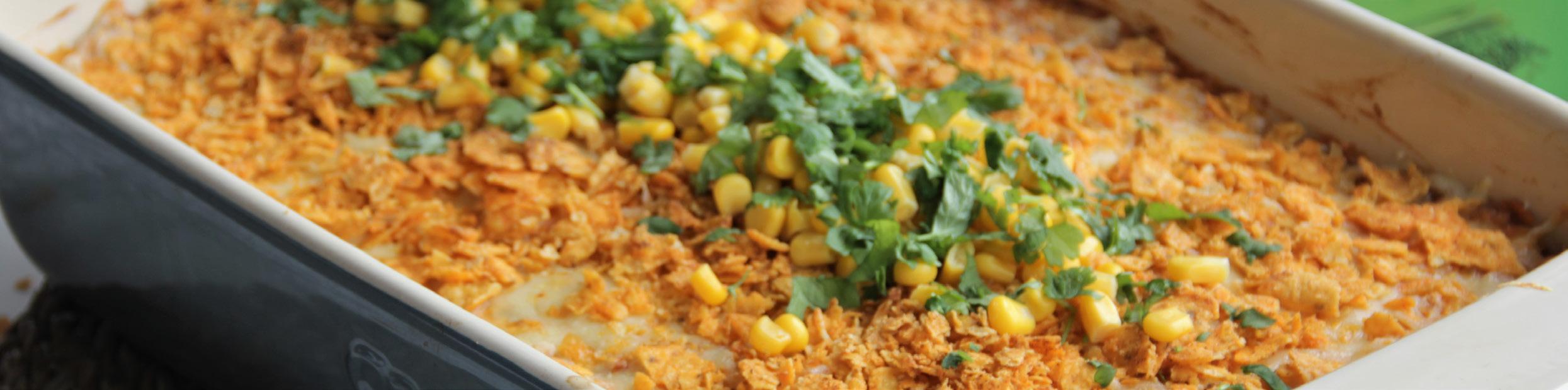 Setjið 4 dl hrísgrjónum í pott ásamt 8 dl af vatni. Kryddið með chilli, papriku, cumin og kjúklingakrafti. Hrærið þar til allt hefur blandast saman. Látið suðuna koma upp á hrísgrjónunum, þegar helmingurinn af vatninu er eftir á hrísgrjónunum setjið þá lokið yfir og slökkvið undir pottinum og látið þau eldast í gufunni. Skerið kjúklinginn smátt niður og setjið í skál á samt baununum, helmingnum af ostablöndunni, taco sósu, rjómaosti og gulum baunum og hrærið. Bætið hrísgrjónunum saman við ásamt salti og pipar og hrærið þar til allt hefur blandast vel saman. Setjið blönduna í eldfast mót og inn í ofn við 180 gráðu hita í 20 mínútur. Takið réttinn út, setjið restina af ostinum og mulið nachos yfir réttinn.