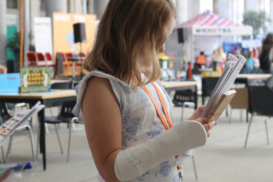 Bei der Stadt-Info haben wir Visums gebastelt und verteilt. Manche Kinder haben auch gefragt, wo welche Arbeiten sind. Wir konnten vielen Kindern weiter helfen und es hat Spaß gemacht.