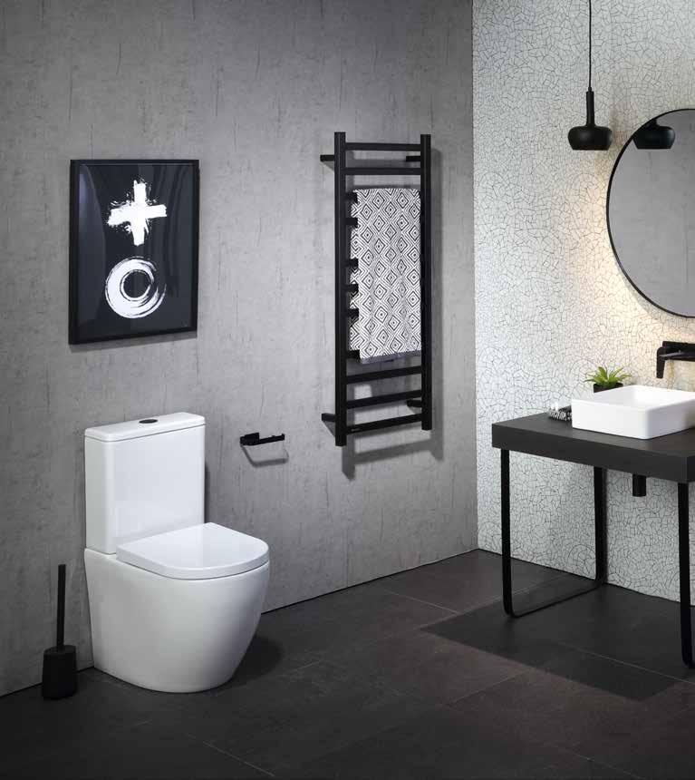 Heiko Wall Faced Toilet w/ Black Toilet Trim Set (sold separately) / Podium Noir Toilet Roll Holder / Studio 1 Noir 1220 Slimline Towel Warmer / 308 Series Noir Wall Basin Mixer / Stadium 360 Countertop Basin w/ Black Bottle Trap (sold separately) / Studio 1 Pole (sold individually) / 209 Series Rain Shower Set / 308 Series Shower Mixer / Black Floor Drain