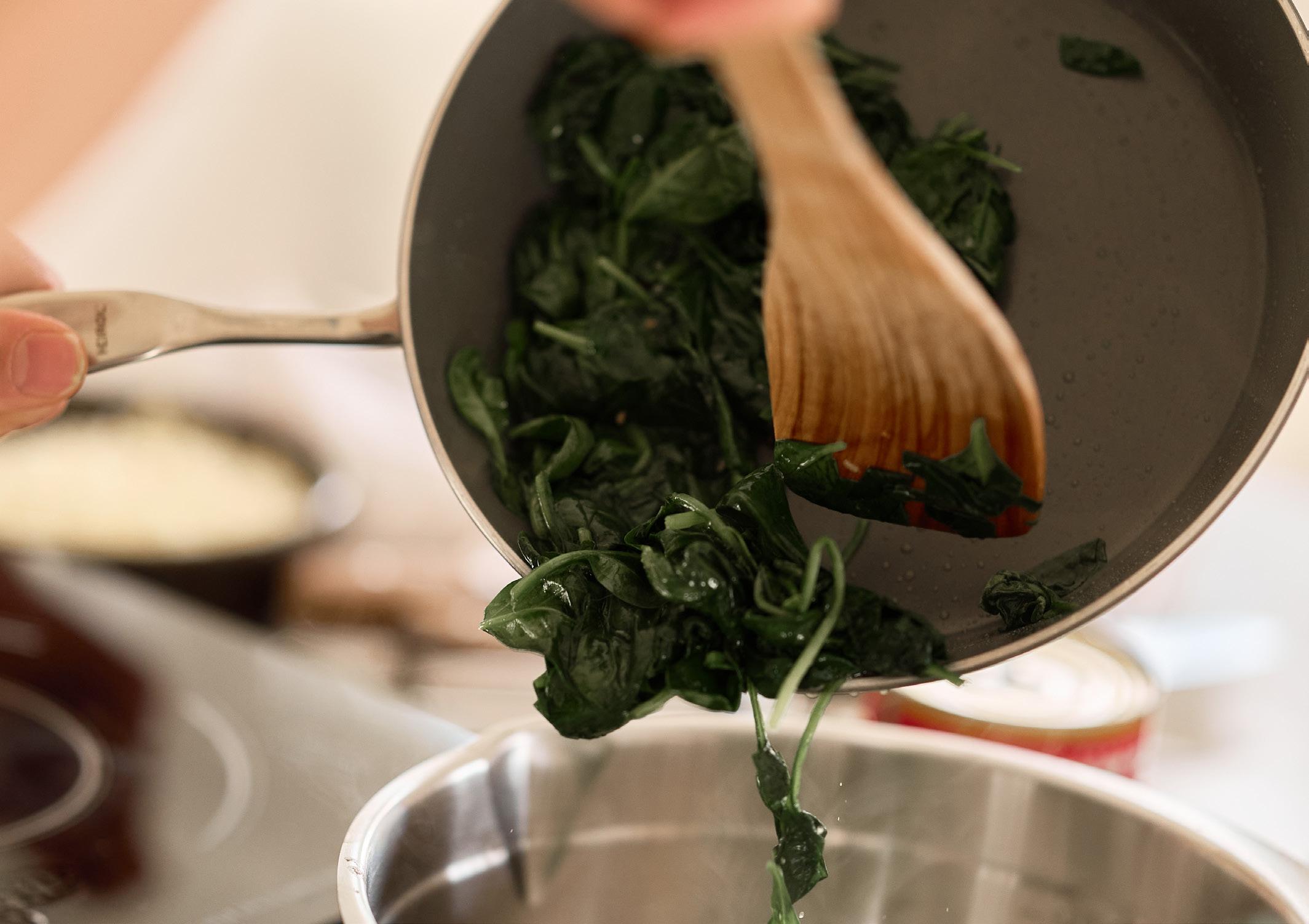 In a pan, sauté garlic in a little olive oil, then add spinach until wilted. Let it cool slightly, then mix with ricotta, egg, Parmesan, salt, and pepper. Put this mixture into a piping bag with a large nozzle.