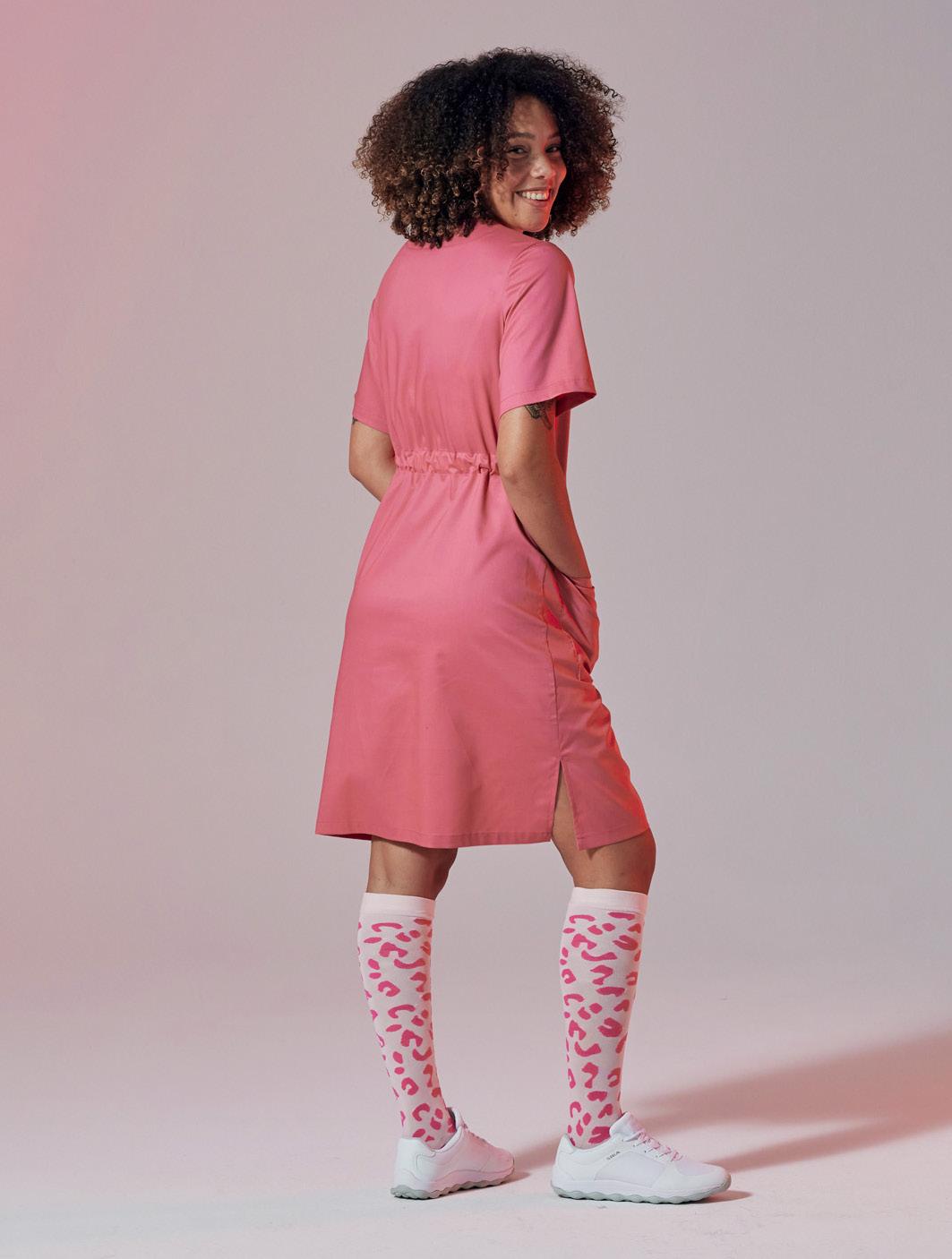Lätt figursydd modell. V-hals. Kort ärm. En framficka med nyckelhälla. Justering av midjevidd. Sidosprund. Längd mitt bak ca 82 cm i stl M. Tillverkad av återvunnen polyester.