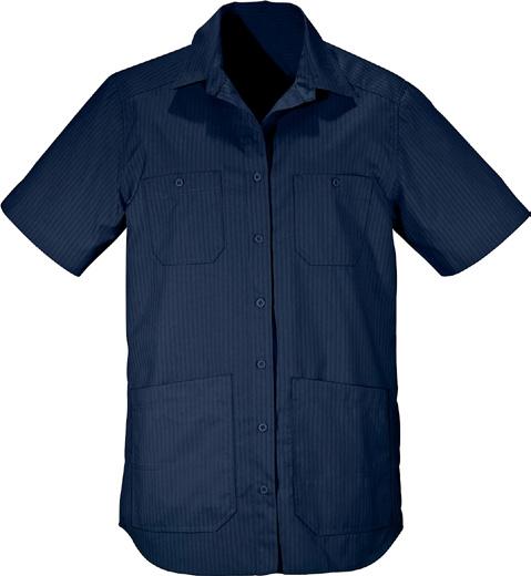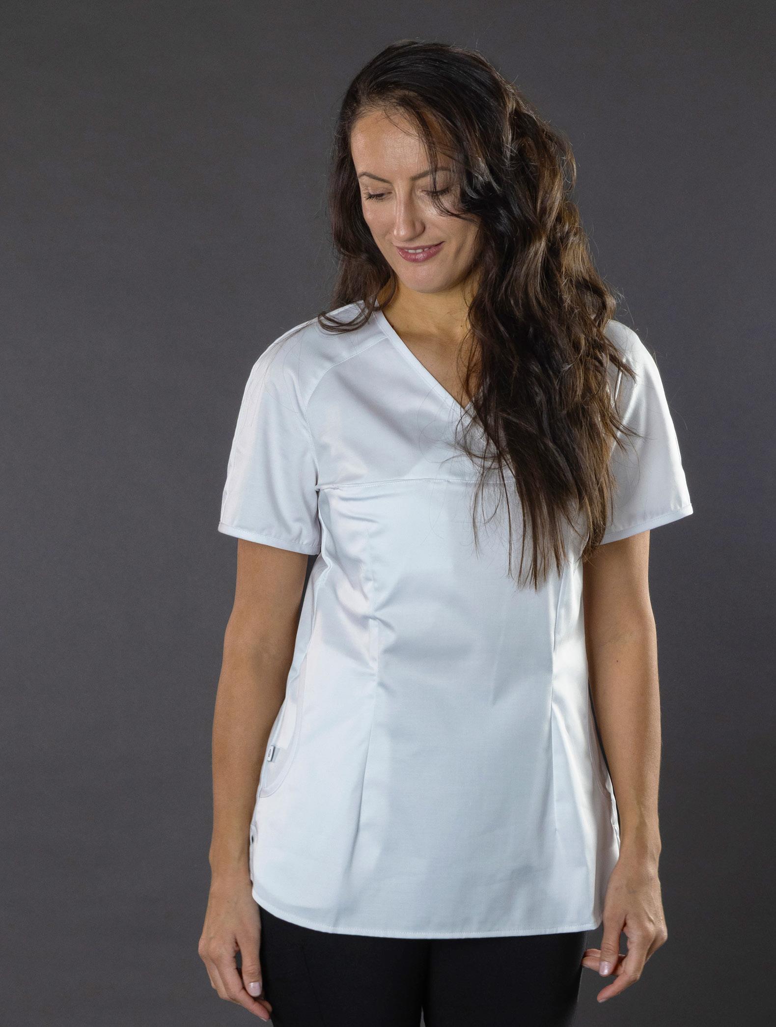 Lätt figursydd modell. V-hals. Kort ärm. Bröstficka. Sidfickor. Nyckelhälla i högra. Sidosprund. Justering av midjevidd. Längd mitt bak ca 75 cm i stl M.