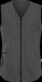 Väljä malli. V-pääntie. Lyhyet hihat. Rintatasku vasemmalla puolella. Puolivuorattu sivutasku, kännykkätasku ja avainpidike oikealla. Etukaarroke. Sivuhalkiot. Ripustinlenkki niskassa. Keskiselän pituus 77 cm koko M. Valmistettu luonnonmukaisesti tuotetusta puuvillasta.