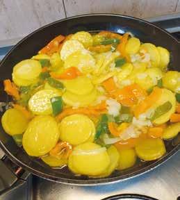 • Hetta upp oljan, det skall vara rikligt med olja. Potatis och grönsaker skall koka i oljan, inte steka. Var därför noga med att inte oljan blir för varm.