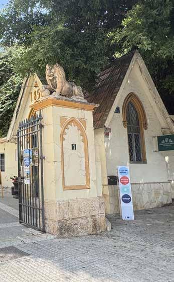 Den eleganta entrén på Avenida de Príes 1 välkomnar besökaren med två ståtliga lejonstatyer som vakar över smidesgrindarna.