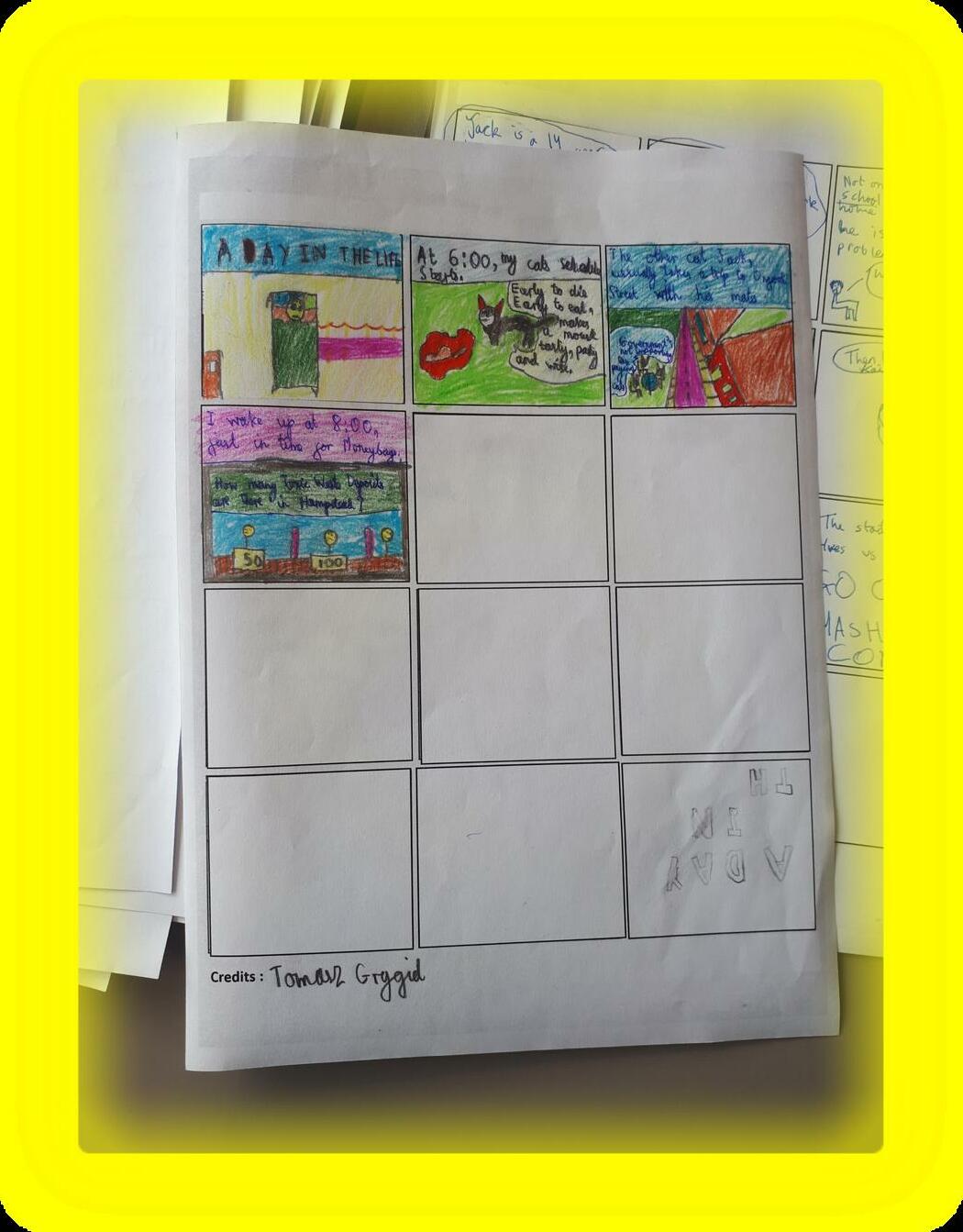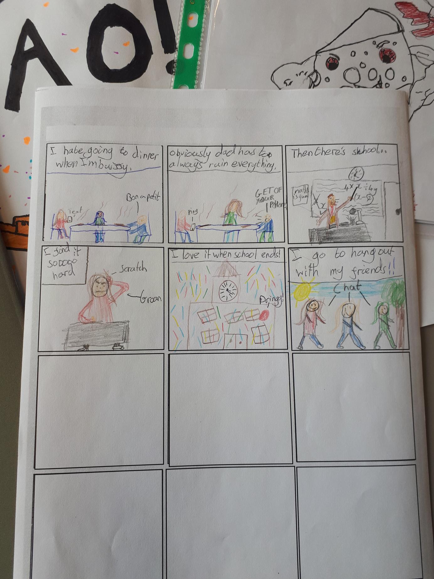 In this workshop, we translated French comic books into a literal translation and a grammatically correct translation After that, we excitedly made our own comic books and presented them to the class. My favourite activity was drawing up comic book strips using coloured pencils because it allowed me to be curious and creative. I was also able to create original designs which inspire me and my fellow classmates. I wrote my comic strip about a video call that ended up being an absolute disaster! It was an utter catastrophy!