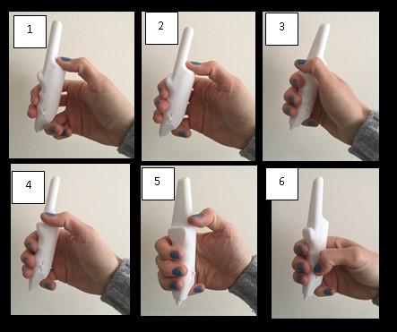 Ergonomic testing of casing design looking at different hand positions.. A foam modelled and 3D printed prototyped used for form testing.