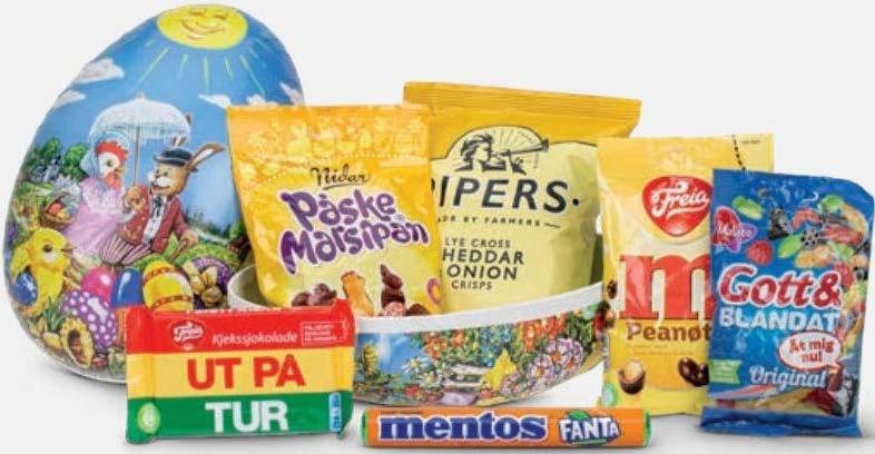 Innhold: Pipers Chips Cheddar Onion 40g, Mentos Fanta 31,Sg Nidar Påske marsipan 138g, Godt & Blandet 50g, M 90g, Kvikk Lunsj47g.