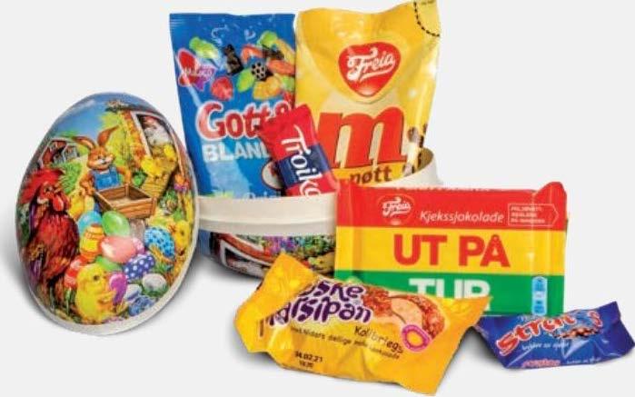 Innhold: Godt & Blandet 50g, Kvikk Lunsj41g, M 90g, Kolibri Marsipanegg 58g, Troika 15g, Stratos bit 10g.