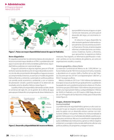 que posibilitó el acceso al agua a un gran número de mexicanos, así como para el Venezuela 41,886 desarrollo del riego y el crecimiento inEgipto dustrial. Arabia México 694 Saudita Liberia 3,982 Al reducirse el agua disponible ha 85 56,188 sido necesario gestionar la demanda susEtiopía Perú Brasil 1,440 65,068 India tancialmente vía instrumentos económi41,865 1,539 co-financieros. Por esto, el sector requiere Argentina 19,968 reformas y modernizaciones con instituFigura 1. Países con mayor disponibilidad natural de agua (m3/hab/año). ciones modernas, fuertes y eficientes, que aprovechen la experiencia hídrica Breve diagnóstico mexicana. Para lograrlo, se reformará la planificación e induEn seguida se presentan los elementos básicos de este plan; el cirán cambios en los tres órdenes de gobierno, así como en lector encontrará mayor detalle en el PNH. La problemática del organizaciones sociales y usuarios. agua cruza los ejes de la institucionalidad, gobernanza, seguridad hídrica y pobreza con carencia del agua. Entorno geográfico, clima y lluvia El agua es suficiente en algunas regiones, pero en 67% del La extensión continental de México es de 1,959,248 km2. La territorio nacional, donde ocurren el mayor desarrollo económilluvia (media anual de 760 mm) es escasa en el norte y noroeste, co y la más alta concentración demográfica, el agua es escasa o y abundante en el sureste, Golfo y Pacífico (al sur del Trópiya comprometida. Entonces, es esencial un modelo de gestión co). Escurren por ríos 331 km3; se evapotranspiran 1,065 km3, y hídrica eficiente y coherente, sustentado en políticas públicas 93 km3 recargan acuíferos. con sentido social, económico y ambiental, y con un sistema México contaba en 2013 con 118.4 millones de habitantes de planeación versátil y potente basado en la obtención de (Conapo); la tasa anual disminuye gradualmente. La población resultados ante los desafíos hídricos (véase figura 1). ha pasado de rural a predominantemente urbana en 50 años. La política hídrica ha respondido a demandas sociales, desde Se estima que para 2050 habrá 150.8 millones de personas que el comienzo del siglo XX, con la gestión de la oferta de agua vivirán una mayor presión hídrica. La disponibilidad en 1950 era para apoyar el desarrollo con programas de obras hidráulicas, lo de 18,035 m3/hab/año, y en 2013 pasó a 3,982 (baja, de acuerdo con el Programa de las Naciones Unidas para el Desarrollo) (véase figura 2). Centro-norte Sur-sureste EUA 9,802