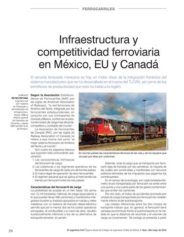 Según la Asociación Estadounidense de Ferrocarriles (AAR, por las siglas de American Association of Railways), “la red ferroviaria de América del Norte, integrada por los ferrocarriles estadounidenses, en conjunto con sus contrapartes de Canadá y México, conforman el sistema ferroviario de carga más eficiente, competitivo y confiable del mundo”. La Asociación de Ferrocarriles de Canadá (RAC, por las siglas de Railway Association of Canada) se refiere a esa misma red como “el mejor sistema ferroviario de América del Norte y el mundo”. Son cuatro los aspectos básicos que soportan esta contundente aseEn los tres países las características técnicas de las vías y de los equipos que veración: circulan por ellas son uniformes. 1. Las características intrínsecas del ferrocarril de carga. Además, toda la carga que se transporta por ferro2. Las coberturas y los regímenes operativos de los carril deja de transitar por las carreteras, la mayoría de ferrocarriles de carga de cada uno de los tres países. las cuales son construidas y mantenidas con recursos 3. El marco legal de operación de esos ferrocarriles. públicos derivados de los impuestos que pagamos los 4. El régimen aduanal que se aplica al intercambio de contribuyentes. bienes por ferrocarril entre los tres países. En el campo de la ecología, por cada tonelada kilómetro bruta transportada por ferrocarril se emite entre Características del ferrocarril de carga una quinta y una cuarta parte de los gases contaminanLa posibilidad de acoplar en un tren hasta 150 carros tes que emiten los camiones. con 15 mil toneladas métricas de carga (equivalente a Por otro lado, el índice de accidentes promedio por lo que pueden llevar 500 camiones) y mantenerlos inteunidad de carga transportada por ferrocarril es notablegrados durante su traslado apoyados en ruedas y rieles mente inferior al del autotransporte. metálicos con un sistema de tracción diésel-eléctrico Las citadas diferencias entre los dos modos de permite que por lo menos dos de los costos operativos transporte indican que, en general, el ferrocarril tiene principales, el combustible y la mano de obra, resulten ventajas económicas frente al autotransporte en la mesustancialmente inferiores a los de su alternativa de dida en que la distancia de recorrido y el volumen de transporte terrestre: el camión. carga se incrementan. Tal ventaja se presenta a partir