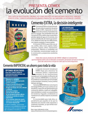 a segunda innovación lanzada por CEMEX llegó para solucionar las molestias grietas y reparaciones constates en las construcciones causadas por la humedad y la filtración del agua. Cemento IMPERCEM es la solución a los problemas ocasionados por la humedad, ya que protegen cimientos, muros y techos del paso del agua. Cemento IMPERCEM tiene como base la tecnología EXTRA, por lo que cuenta con sus beneficios: reducción de agrietamiento por contracción plástica, mejora en trabajabilidad y facilidad en curado. Las características de resistencia, fraguado y rendimiento se mantienen sin cambio respecto al cemento actual. Es recomendable para toda obra, especialmente para aquellas en las que los elementos de concreto están expuestos a ambientes húmedos, ya que brinda excelente protección.