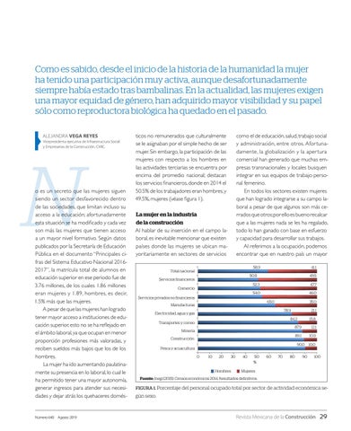Como es sabido, desde el inicio de la historia de la humanidad la mujer ha tenido una participación muy activa, aunque desafortunadamente siempre había estado tras bambalinas. En la actualidad, las mujeres exigen una mayor equidad de género, han adquirido mayor visibilidad y su papel sólo como reproductora biológica ha quedado en el pasado. ALEJANDRA VEGA REYES Vicepresidenta ejecutiva de Infraestructura Social y Empresarias de la Construcción, CMIC.
