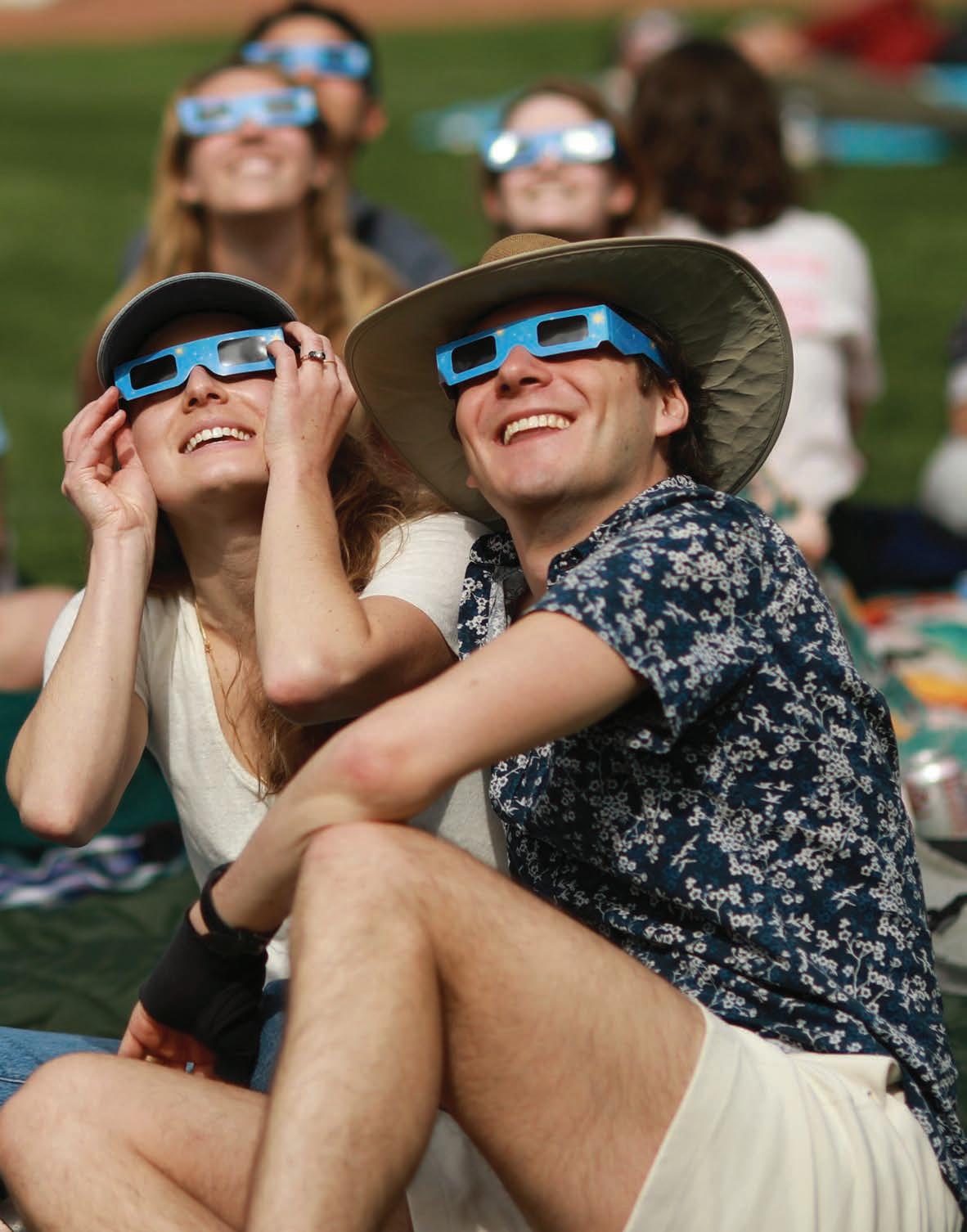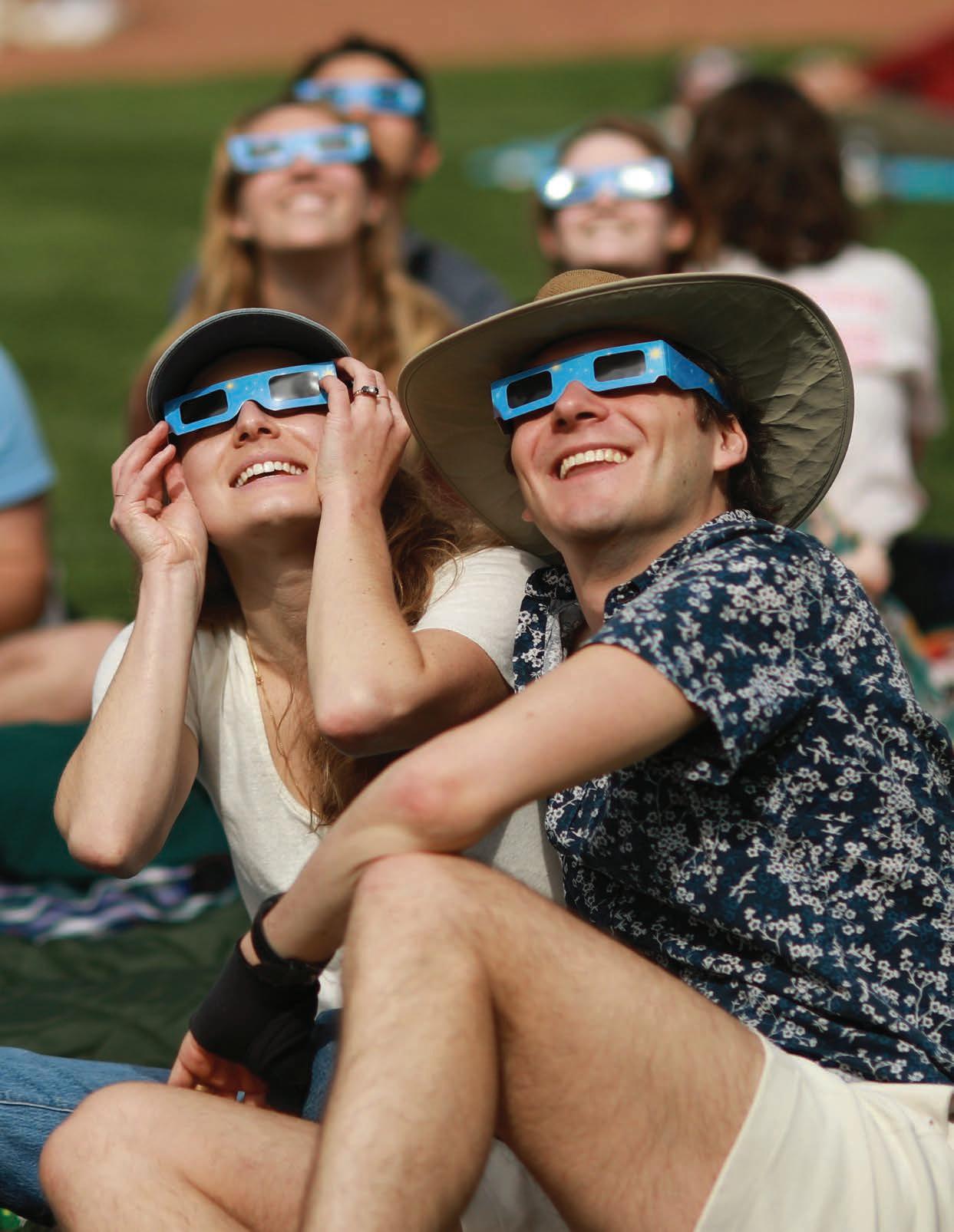 ❱ Students, faculty, staff and visitors watch the eclipse on the Law School’s Holcombe T. Green Lawn on April 8.