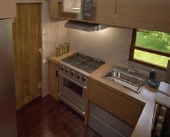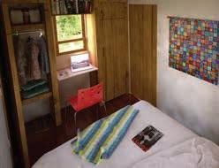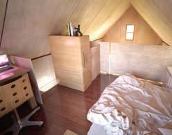 There’s storage space in built-in cupboards in different areas as well as under the raised floor. It has a standing seam, metal roof, cedar board-and batten siding and a tiny integral porch. The interior is all knotty pine. The vaulted ceiling is 4.75 m tall at the peak.