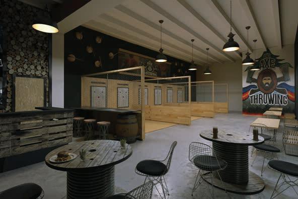 Design of all the axe throwing-bar locations in several USA-Canada locations. The interior design combines wood, concrete and other raw materials to create a rustic, reclaimed feel mixed with modern fittings.