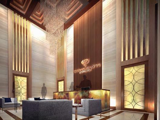 Interior design for the common areas (lobby, hallways and cafe). The design reinterprets the region’s heritage in a contemporary way. The materials used include glass, brushed bronze, polished clear stones, cream travertine flooring, venetian stucco walls, handmade rugs, and serpeggiante marble walls.