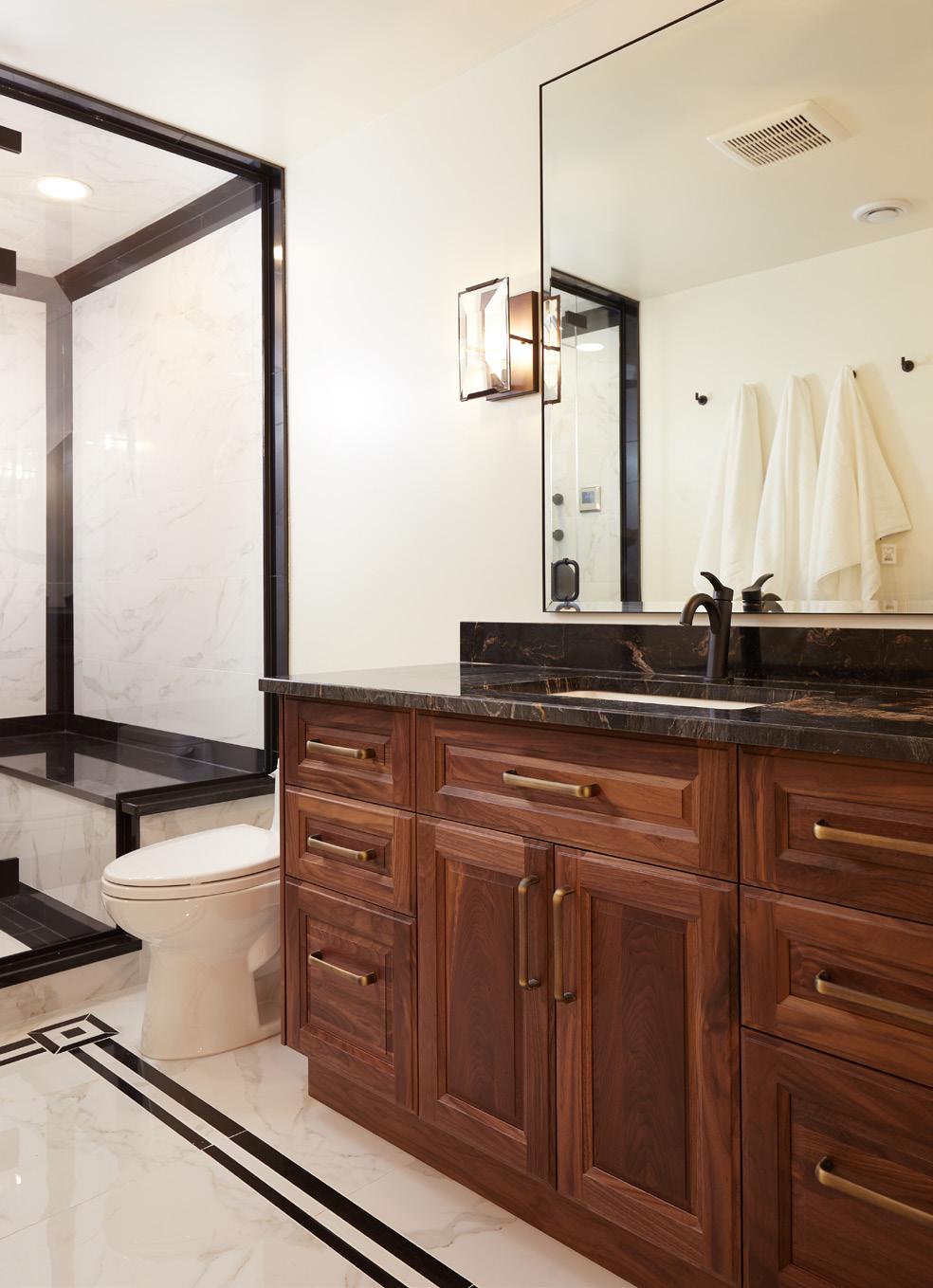 In contrast to a half-bath, an ensuite is tailored to fit the specific needs of a client who often dreams of an oasislike result. For one couple, Brix designed a bathroom and walk-in closet separate from the bedroom so that the husband, a doctor who was frequently on-call, could get ready for work without waking his wife.