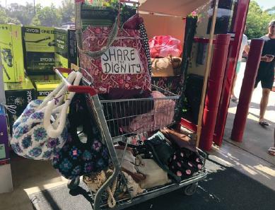 Lorraine lay on her cardboard lined mattress with a wooly blanket and pillow and settled down for a sleepout on Gympie Terrace with a straw hat at the ready for donations to assist Santa’s Classy Helpers