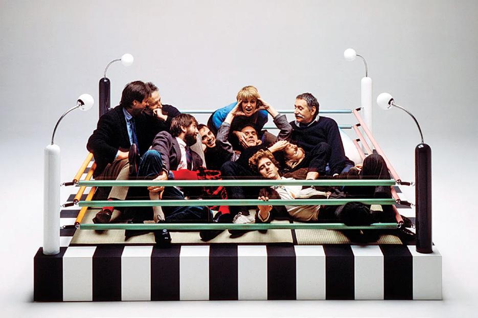 Original Memphis group members in Masanori Umeda’s ‘boxing ring bed’ (1981) which inspired this fabric selection. “...BeetleJuice was also on the moodboard” - Shannon, YOWIE