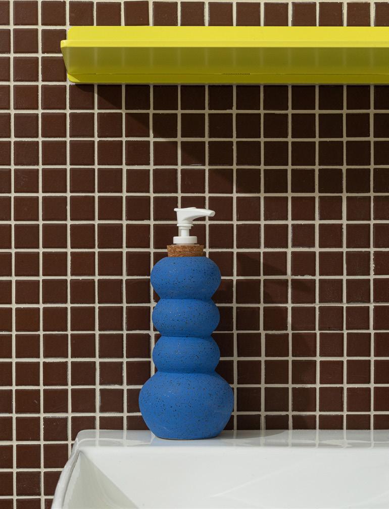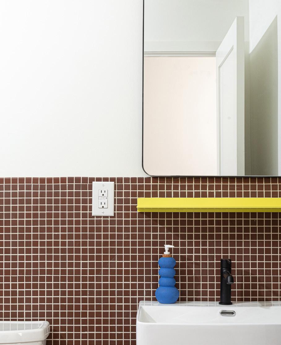 All of our suite bathrooms feature Keystones, this suite uses Brownberry D118 and a custom mosaic by YOWIE on the floor. Shelf is Tromso 1 in banana by Shelfology, see at shelfology.com, reach out to hello@shopyowie.com for help customizing. The custom soap dispenser is by Cloud 9 Clay and available at shopyowie.com