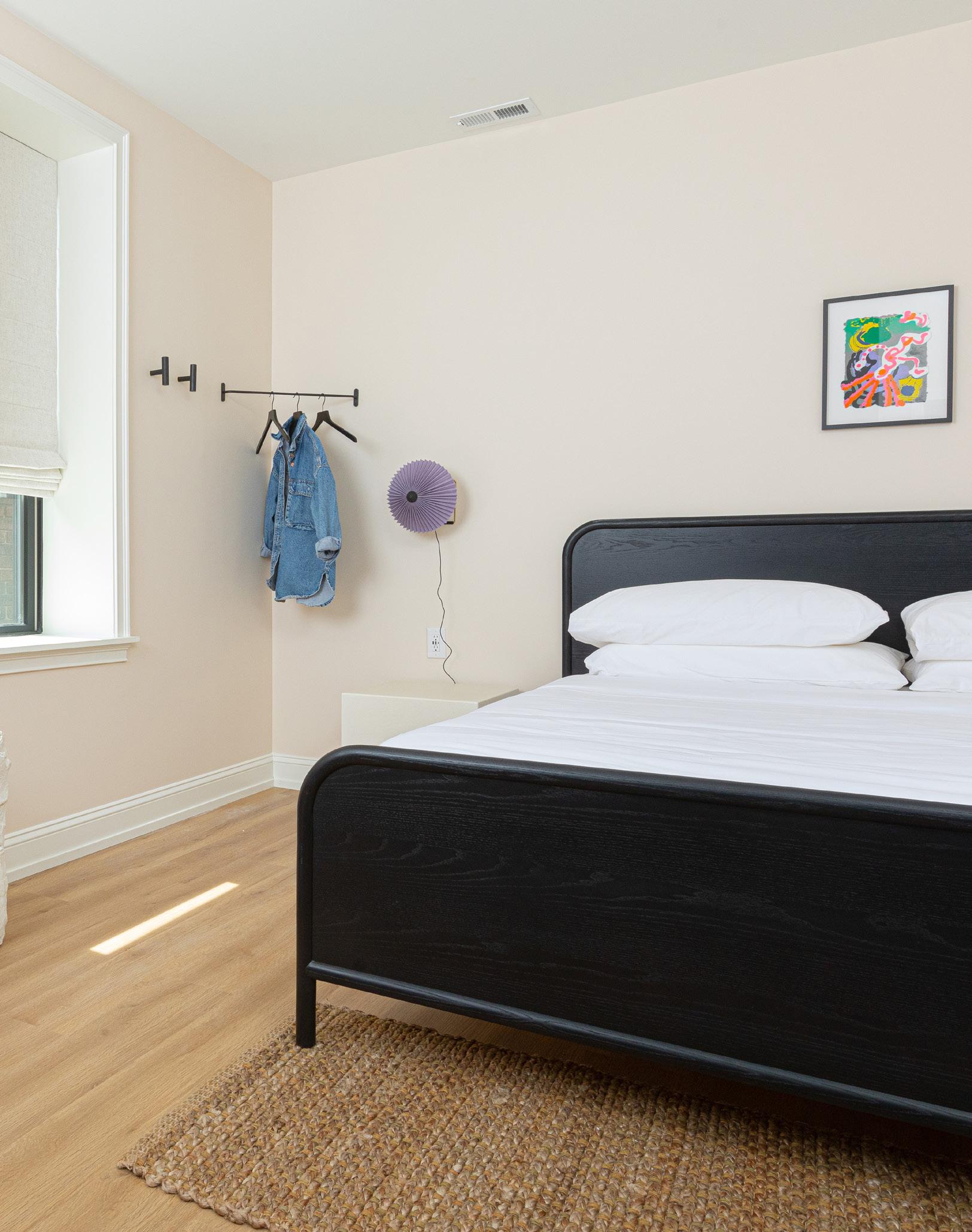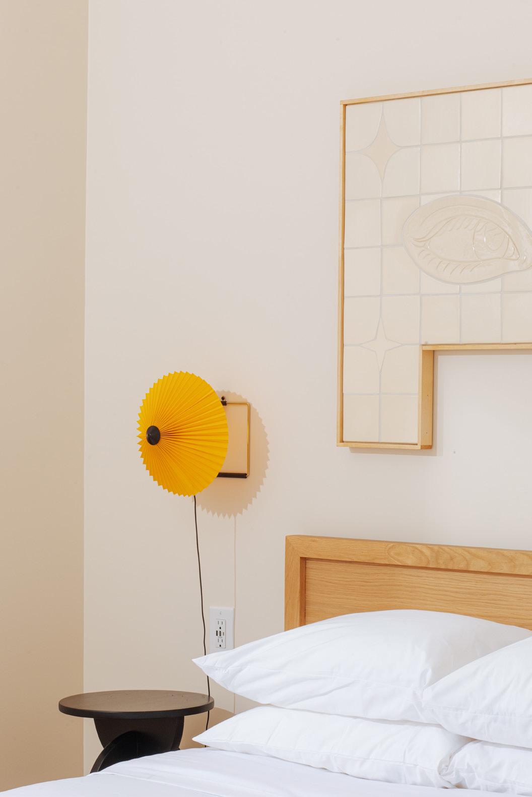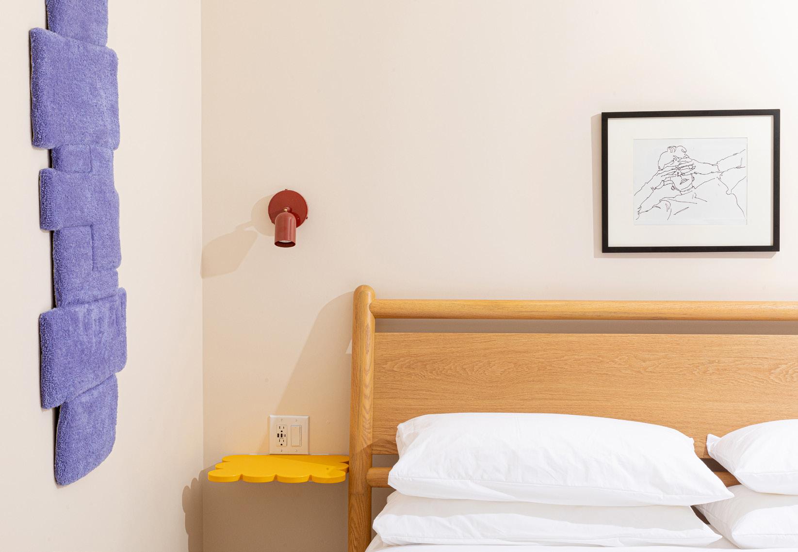 Our coziest suite features some of our favorite pieces! Framed artwork by Meredith Sellers, similar works from $500, meredithsellers.com, Stock Table by Normann Copenhagen, $750, contact hello@shopyowie.com, Marcel bed by EQ3, from $1,399, hello@shopyowie.com, Runner by Target, Mori sconce by RBW, $590, hello@shopyowie.com