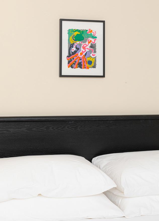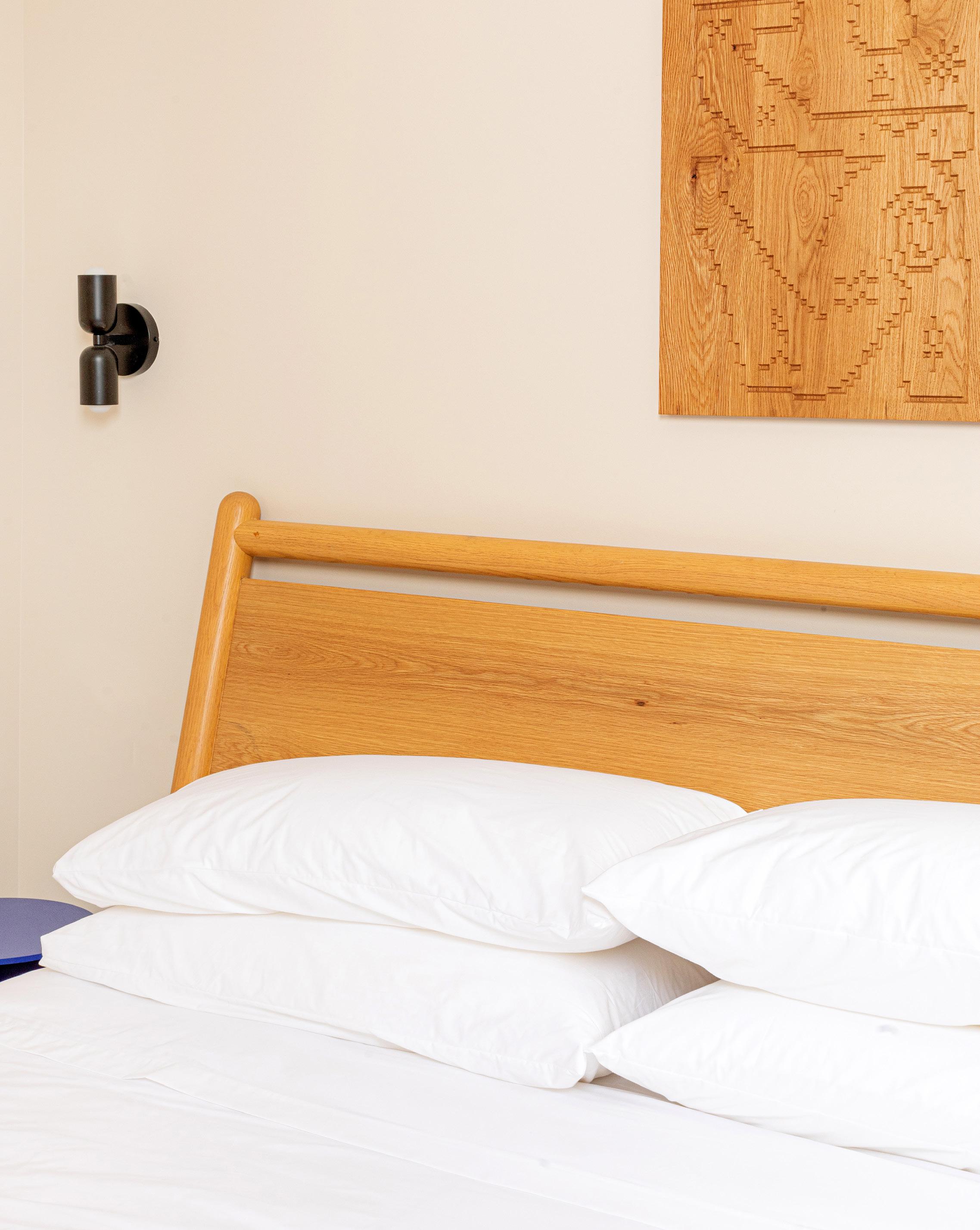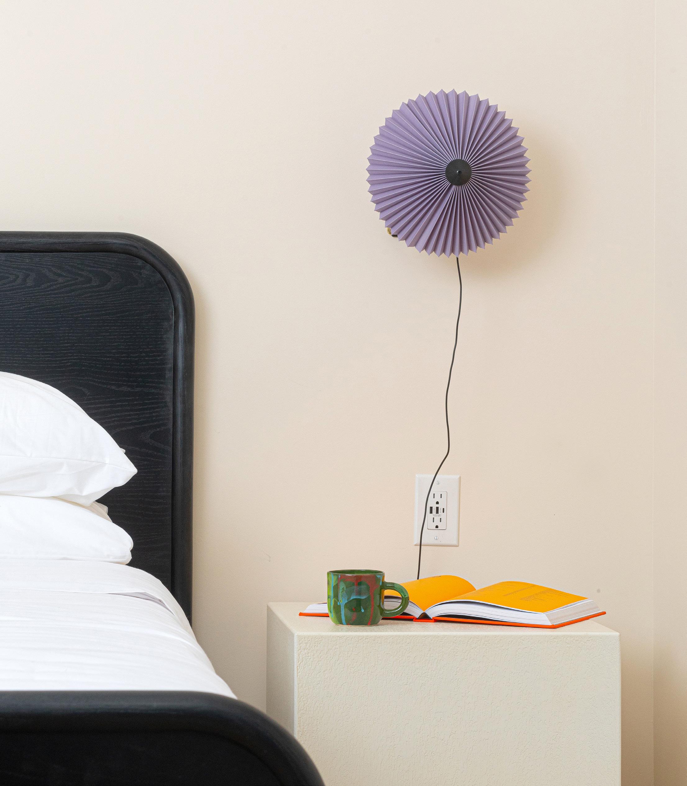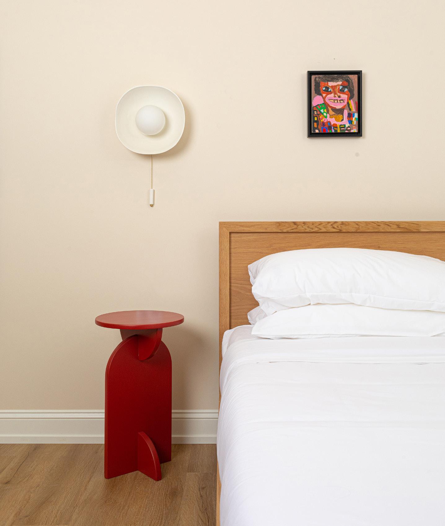 Our coziest suite features some of our favorite pieces! Framed artwork by Meredith Sellers, similar works from $500, meredithsellers.com, Stock Table by Normann Copenhagen, $750, contact hello@shopyowie.com, Marcel bed by EQ3, from $1,399, hello@shopyowie.com, Runner by Target, Mori sconce by RBW, $590, hello@shopyowie.com