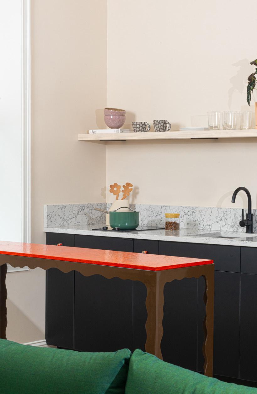 Living room and Kitchen details: Coffee Table by Frunzi (see above), Hart rug in olive by Revival, from $139, Ceramic artwork on wall by Isabella Arkhantas, starting at $600, isa.akh215@gmail.com Mugs by Chinelo and bowls by Ekua available at shopyowie.com