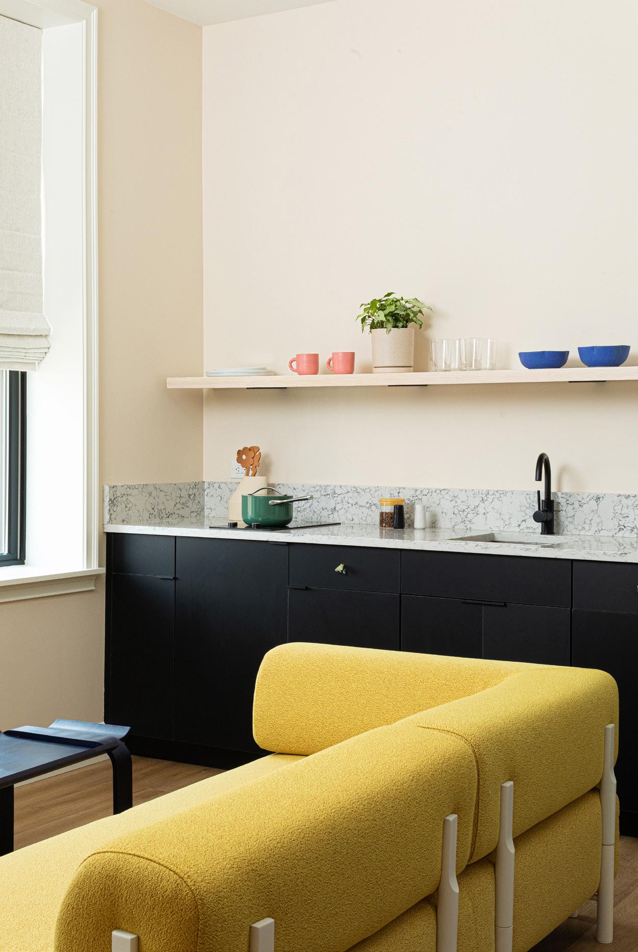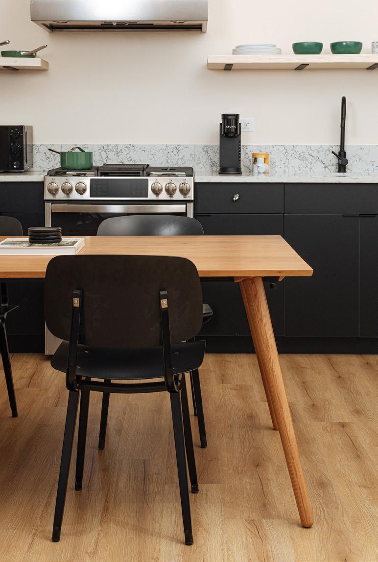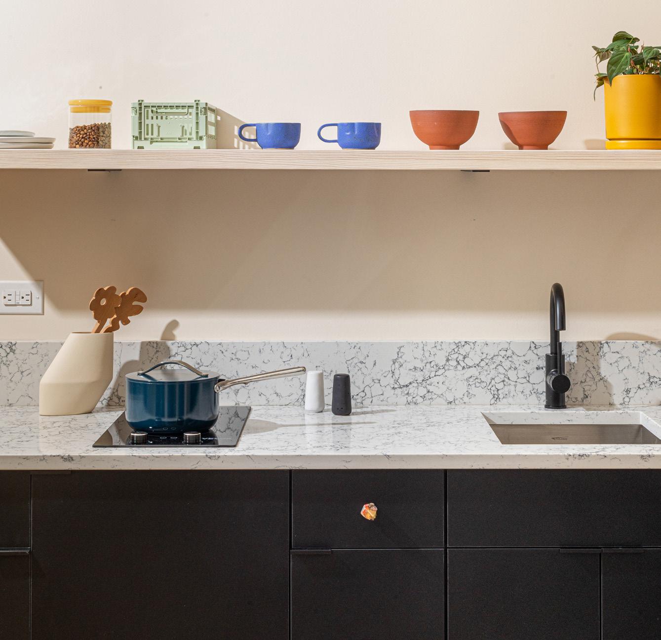 Our kitchens feature sleek cabinets that are locally made and counter tops by Daltile in Rushmore. Each drawer pull is one of a kind by Chen Chen & Kai Williams, one of our very first artist partners at YOWIE