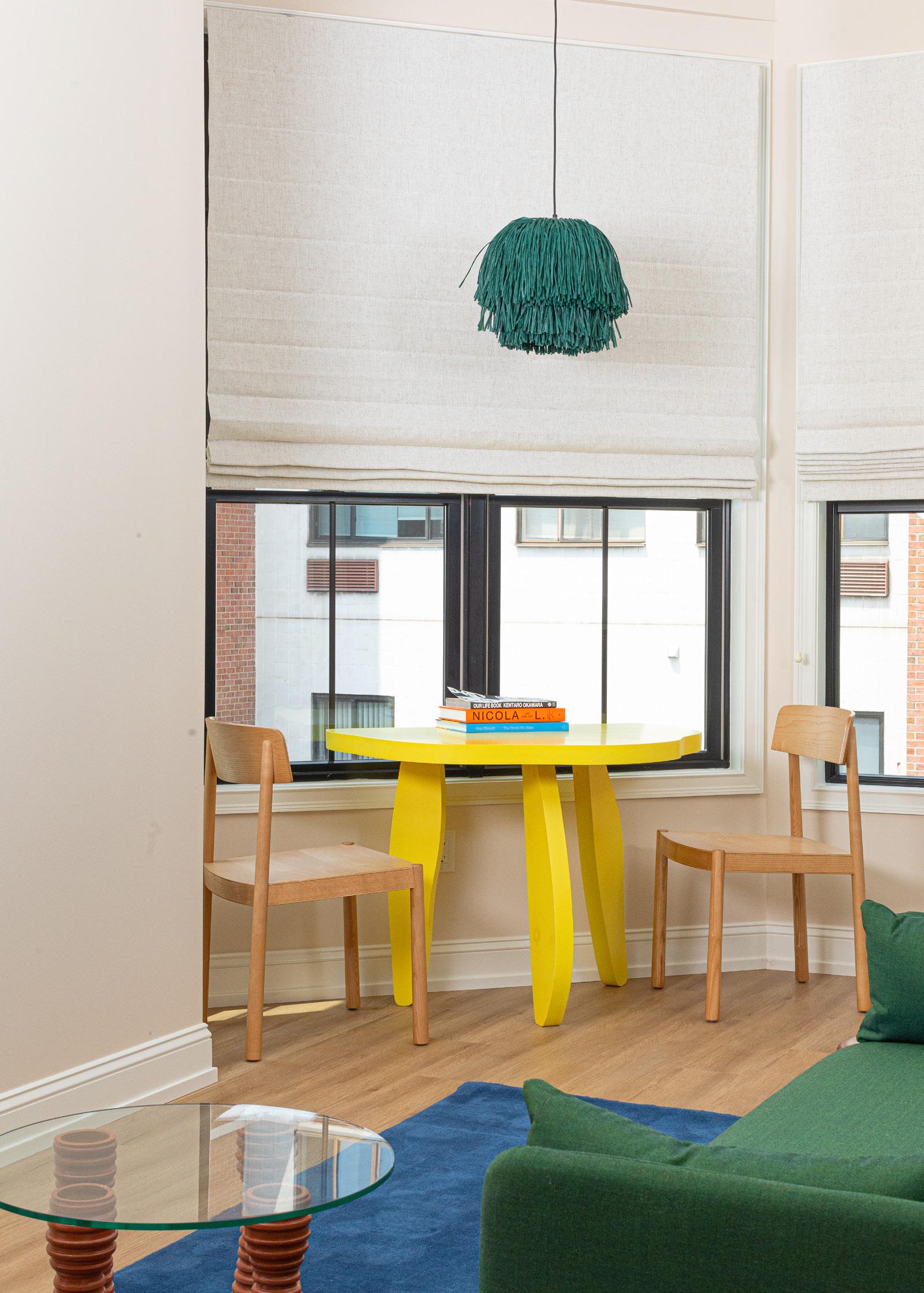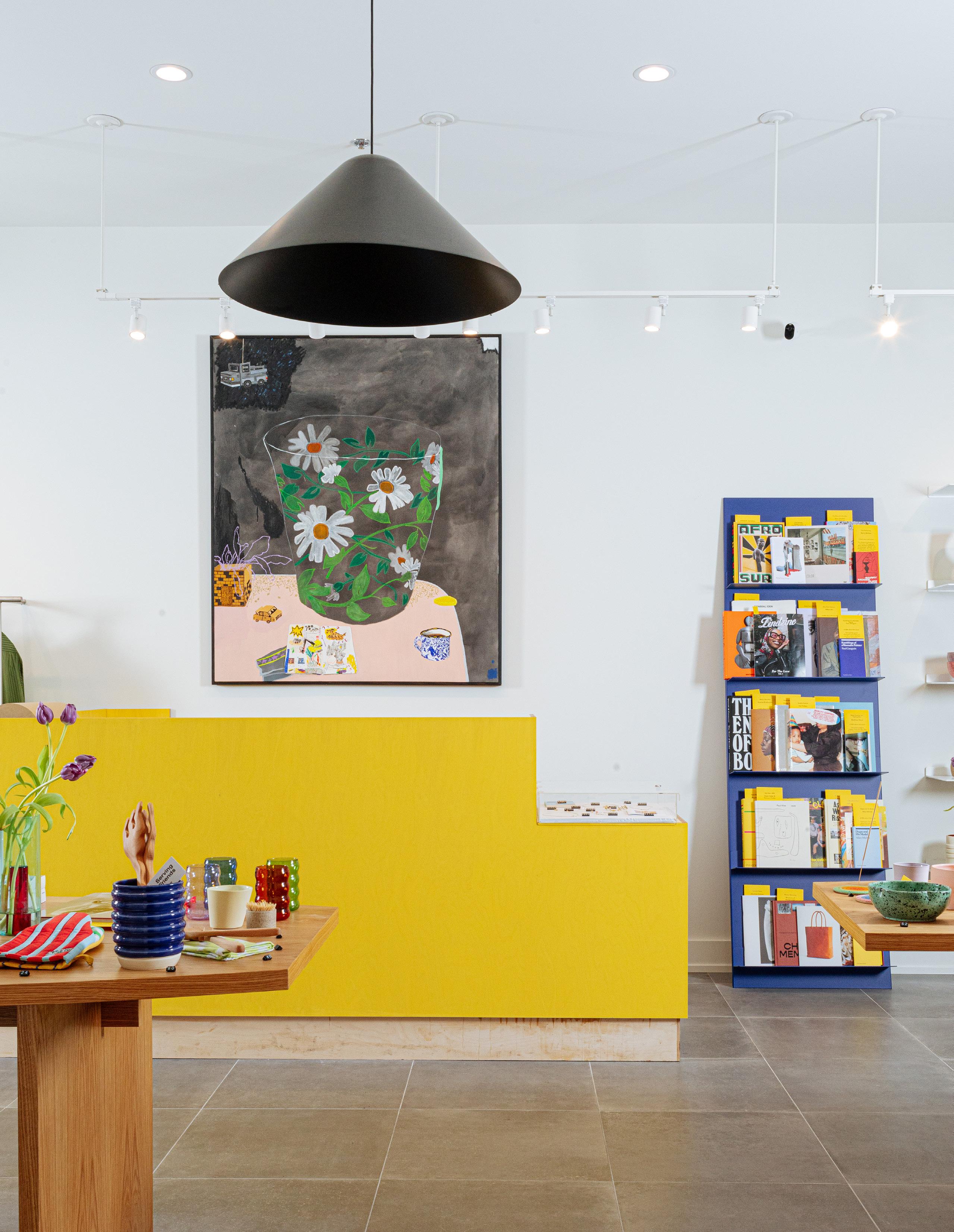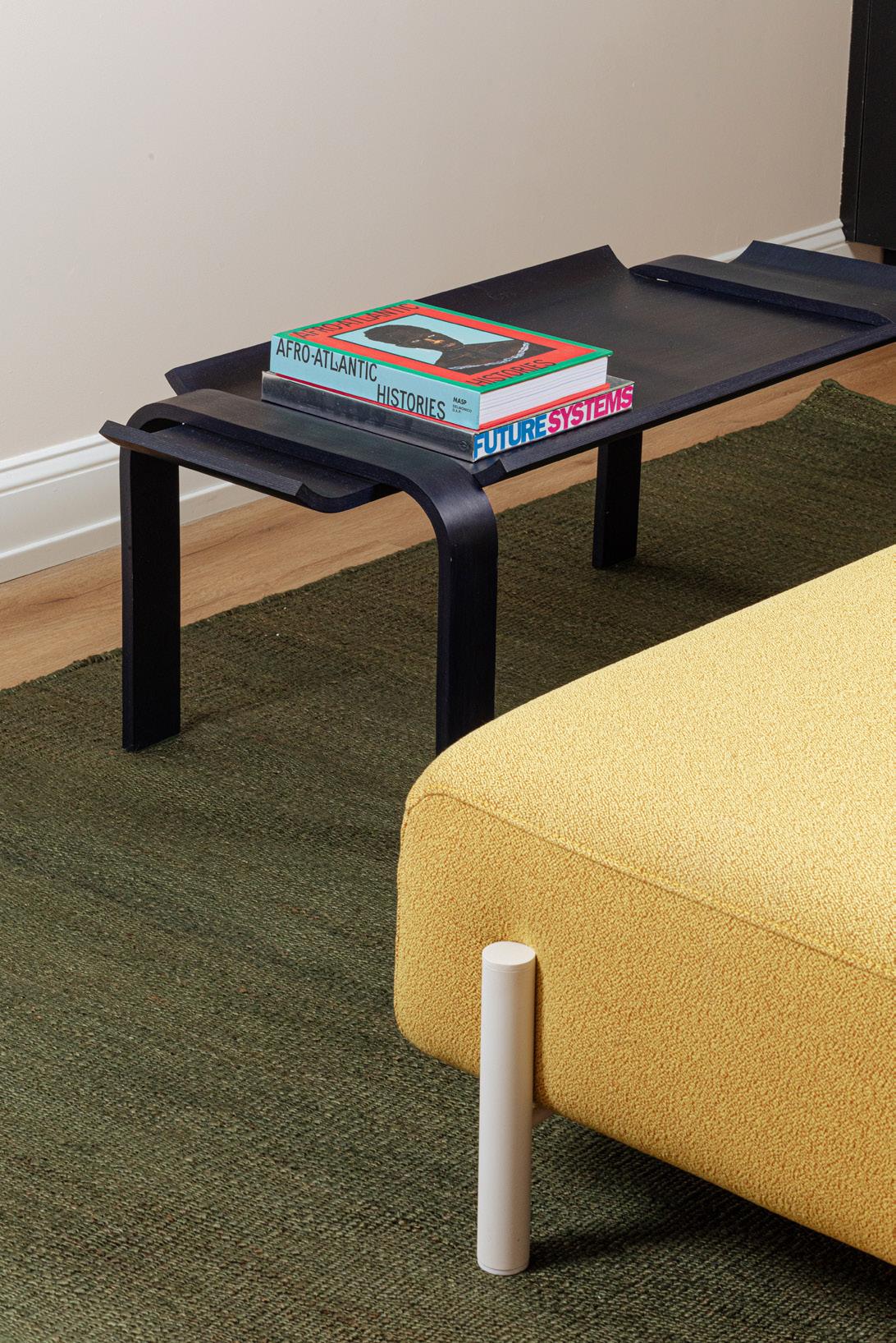 Living room details: Timb chair by Normann Copenhagen, $620, contact hello@shopyowie.com to order, Custom yellow table by Paradise Gray, paradisegray.com, All books are available at shopyowie.com, Afteroom sofa by Audo, Starting at $3,500, hello@shopyowie.com, Ceramic and glass coffee table by Whitney Simpkins, $750, wesimpkins@gmail.com, Rug is grand in deep blue, from $895 at Nordic Knots, hello@shopyowie.com