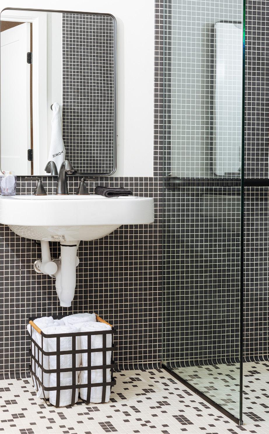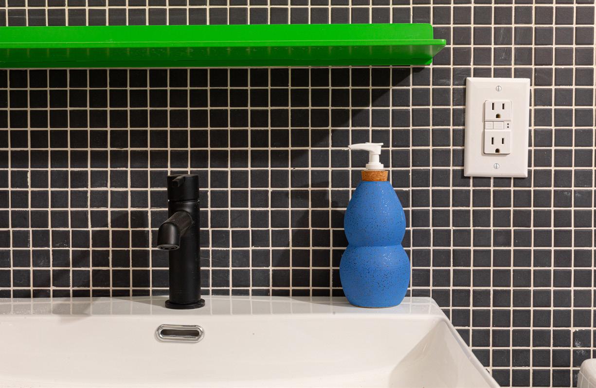 All of our suite bathrooms feature Keystones tile on our floor and walls from our partner Daltile. This Suite uses Black/Ebony D311 and a custom mosaic by YOWIE on the floor. The custom soap dispenser is by Cloud 9 Clay and available at shopyowie.com, shelf from Shelfology, Need help customizing your shelves? hello@shopyowie.com
