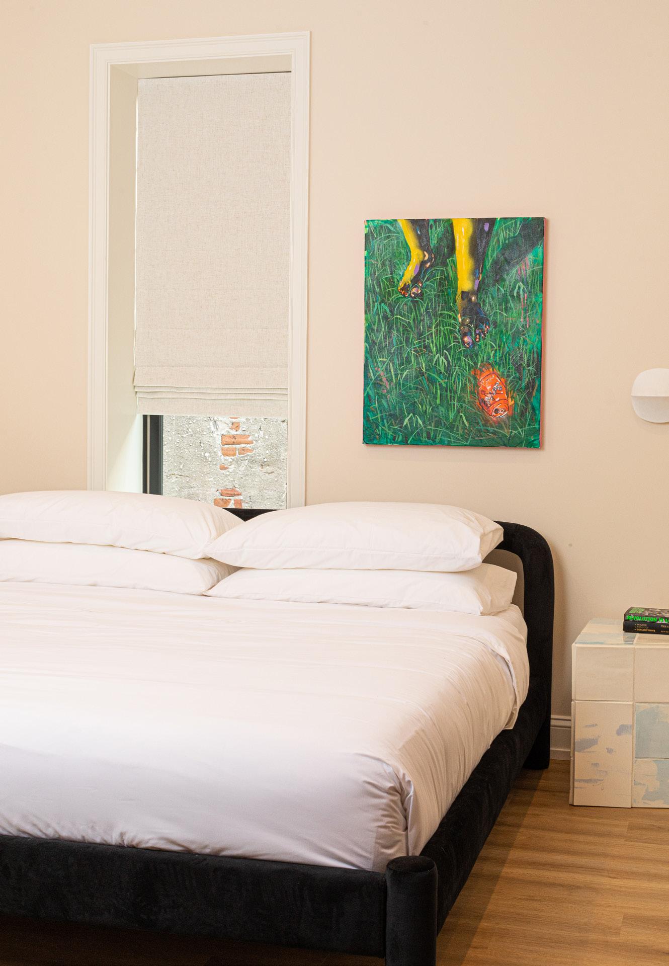 Small space, big design! Original painting by Patricia Renee Thomas, $3,000, contact hello@shopyowie.com to purchase this work, Side table made to order by Liz Colyar, $850, lizcolyar.com, Temi Bed by Sun at Six, from $1,200, hello@shopyowie.com Runner by Target, target.com, Mori Sconce by RBW, $590, hello@shopyowie.com